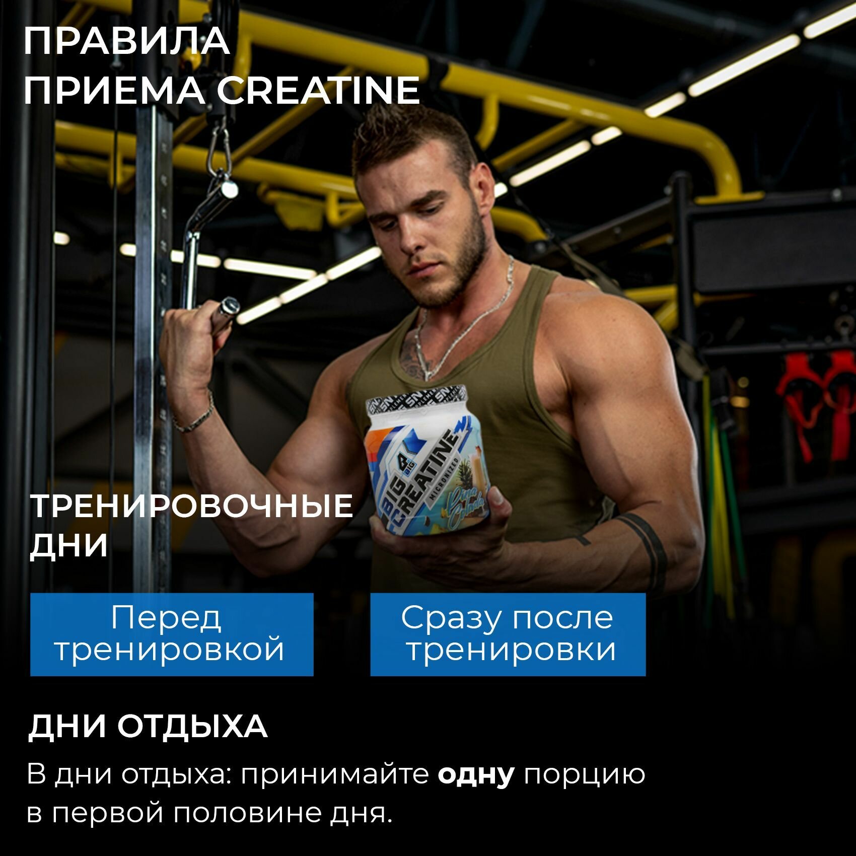 Ниже Вы можете прочитать отзывы на Креатин моногидрат BIGSNT BIG CREATINE для набора мышечной массы, силы и выносливости / спортивное питание, 400 г, 80 порций, вкус Пина Колада, ознакомится с подробными характеристиками, посмотреть интересные обзоры и фотографии на Креатин моногидрат BIGSNT BIG CREATINE для набора мышечной массы, силы и выносливости / спортивное питание, 400 г, 80 порций, вкус Пина Колада.