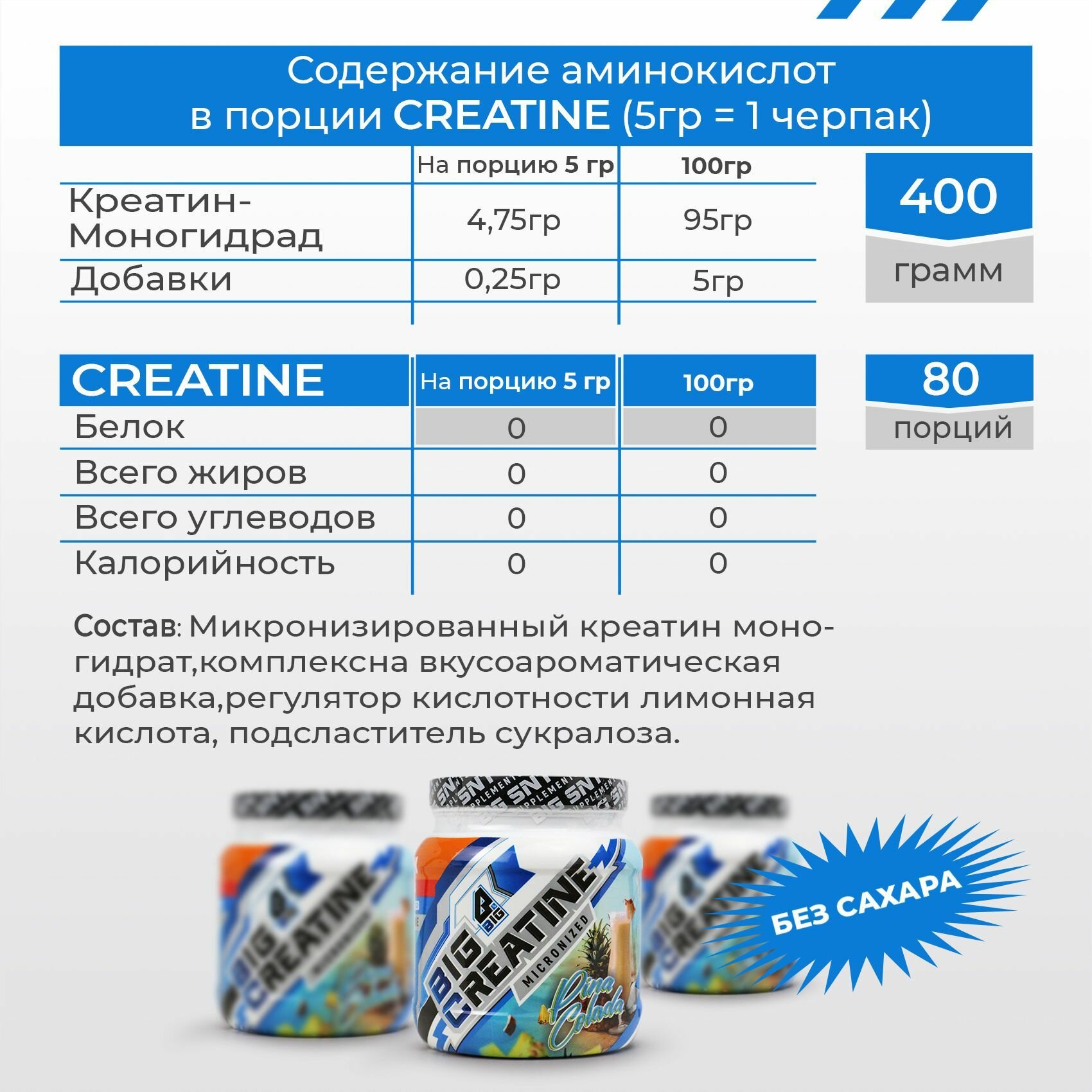 Купить Креатин моногидрат BIGSNT BIG CREATINE для набора мышечной массы, силы и выносливости / спортивное питание, 400 г, 80 порций, вкус Пина Колада