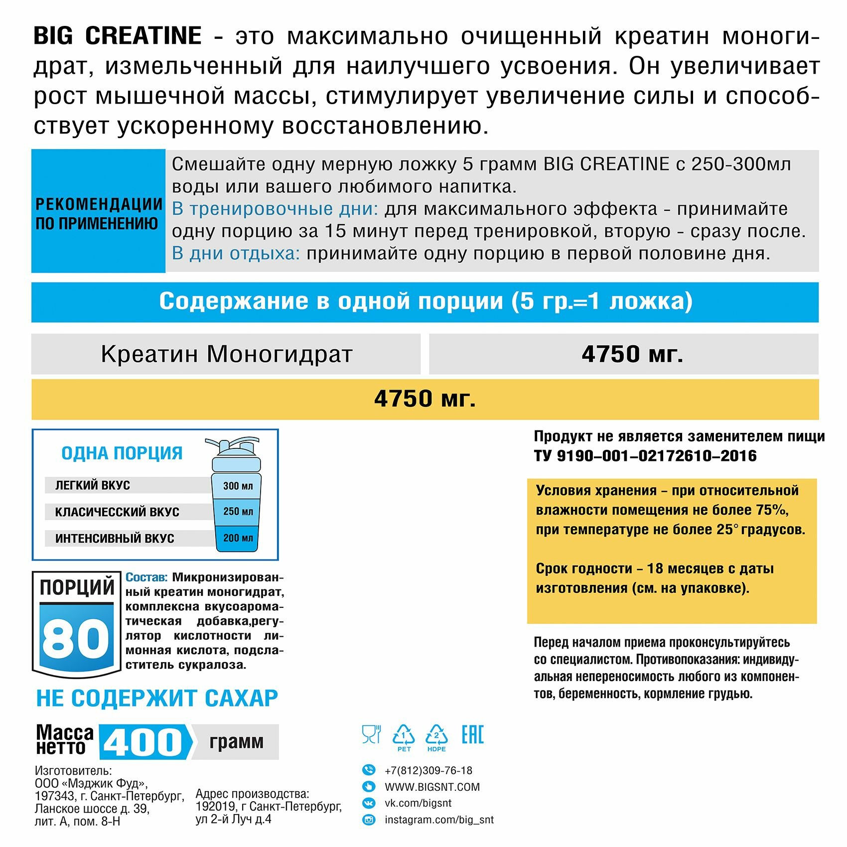 Креатин моногидрат BIGSNT BIG CREATINE для набора мышечной массы, силы и выносливости / спортивное питание, 400 г, 80 порций, без вкуса