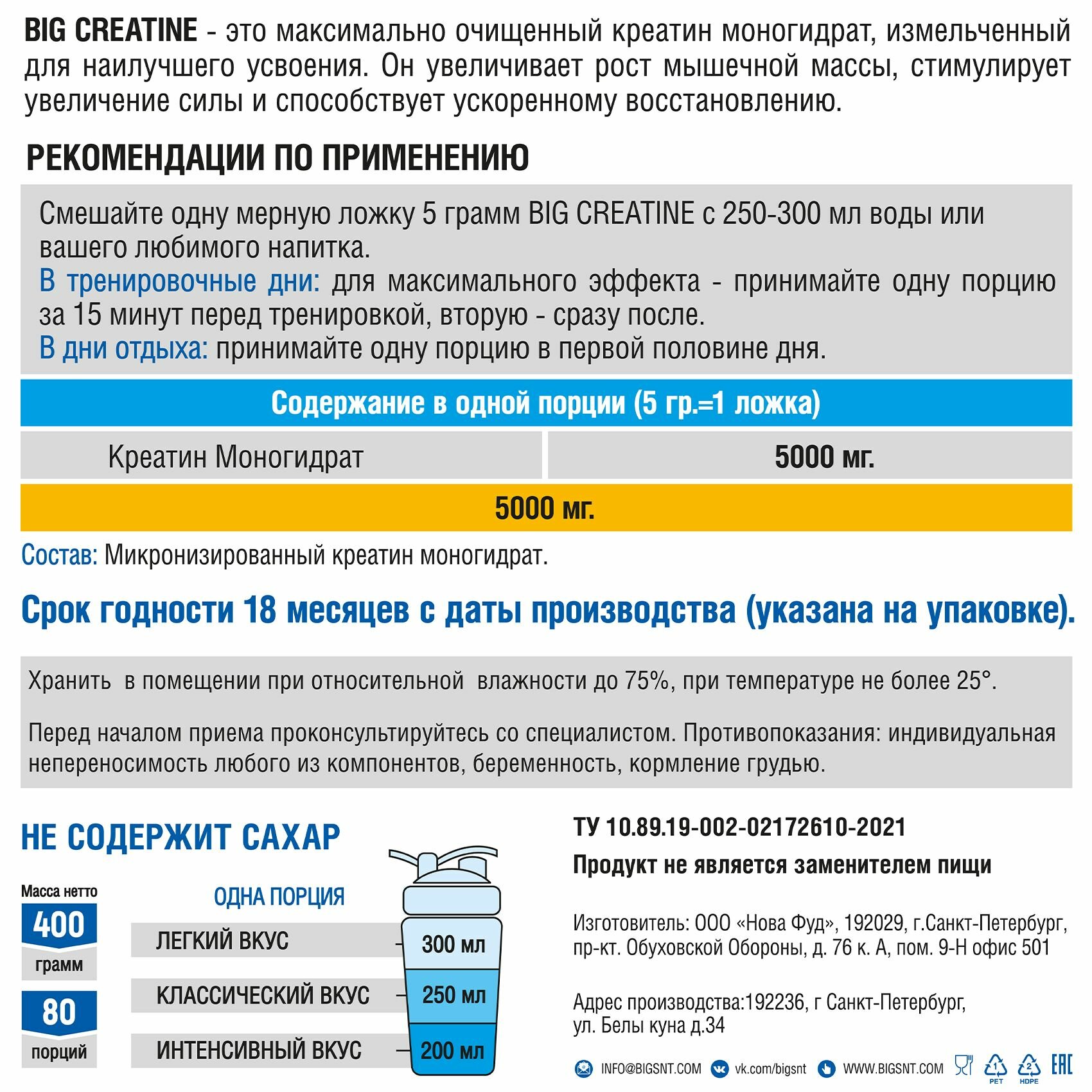 Креатин моногидрат BIGSNT BIG CREATINE для набора мышечной массы, силы и выносливости / спортивное питание, 400 г, 80 порций, вкус Адреналин
