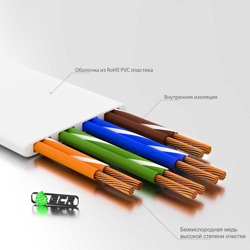 | Плюсы: | Тонкий плоский мягкий кабель. Идеально и аккуратно получилось проложить в штробу рядом с толстым силовым кабелем. Работает в режиме 1гбит. |