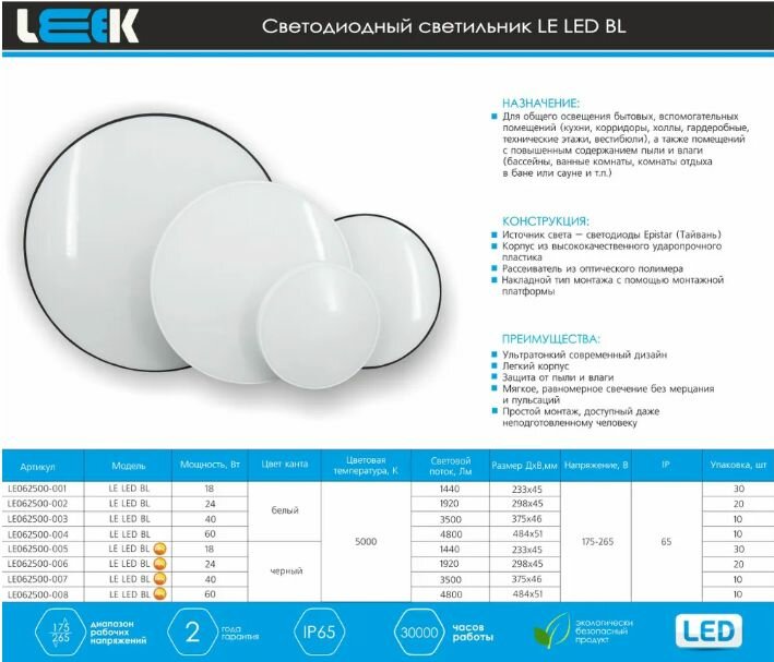 Светильник светодиодный потолочный LE LED BL IP65 18W 5000K LE062500-001 LEEK