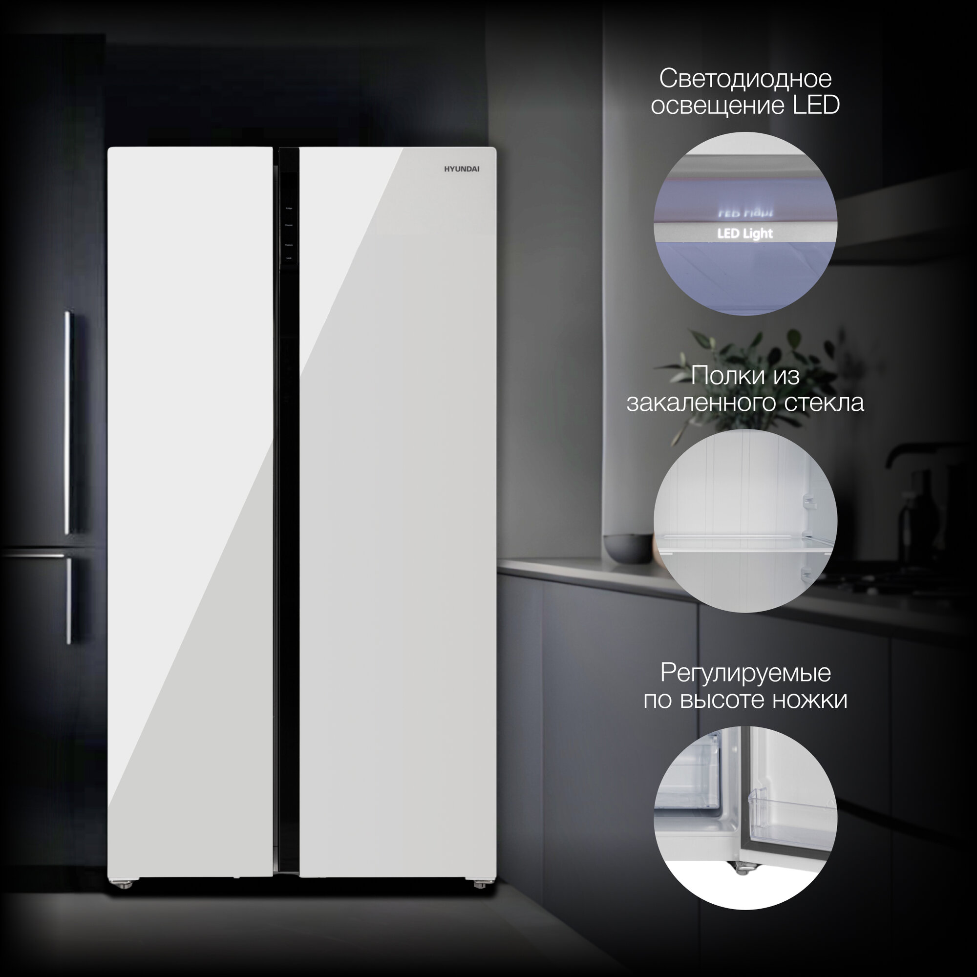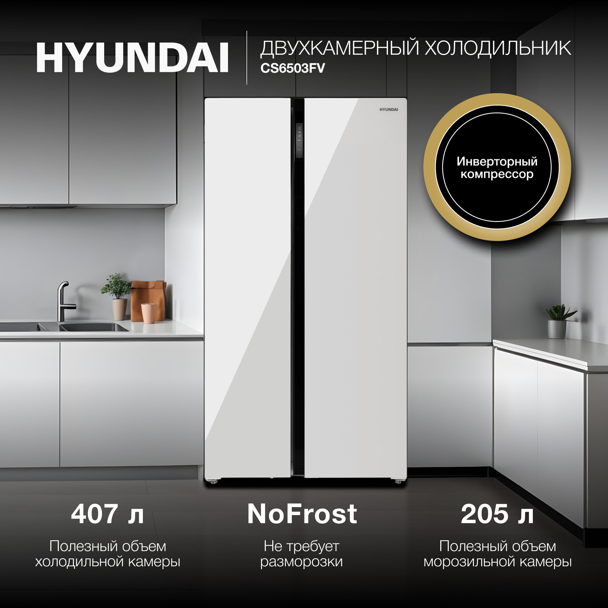 Холодильник Side by Side Hyundai CS6503FV белое стекло