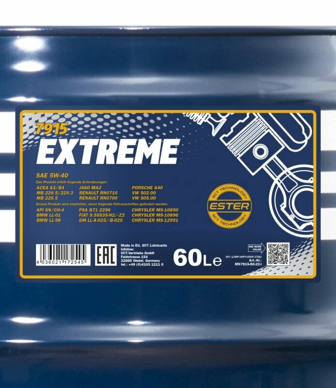 7915-60 mannol extreme синтетическое моторное масло 5w40 sn/cf 60л. mannol mn791560