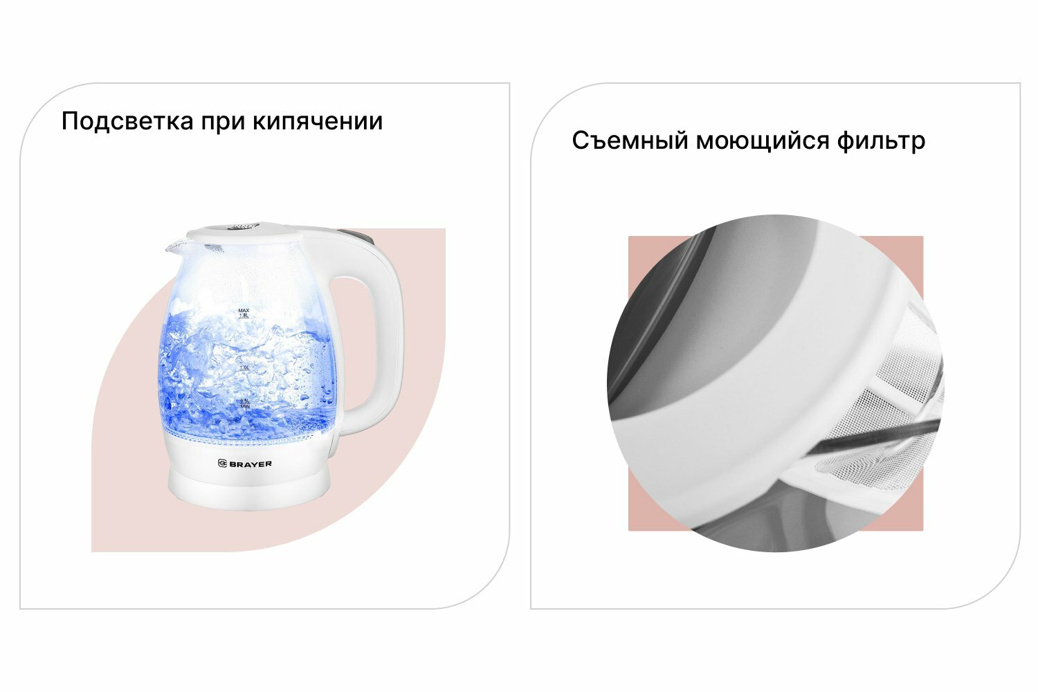 Чайник Электрический 1.8Л 2200ВТ Диск Стекло Внутр Подсв Встроен Фильтр Белый Brayer Br1013w