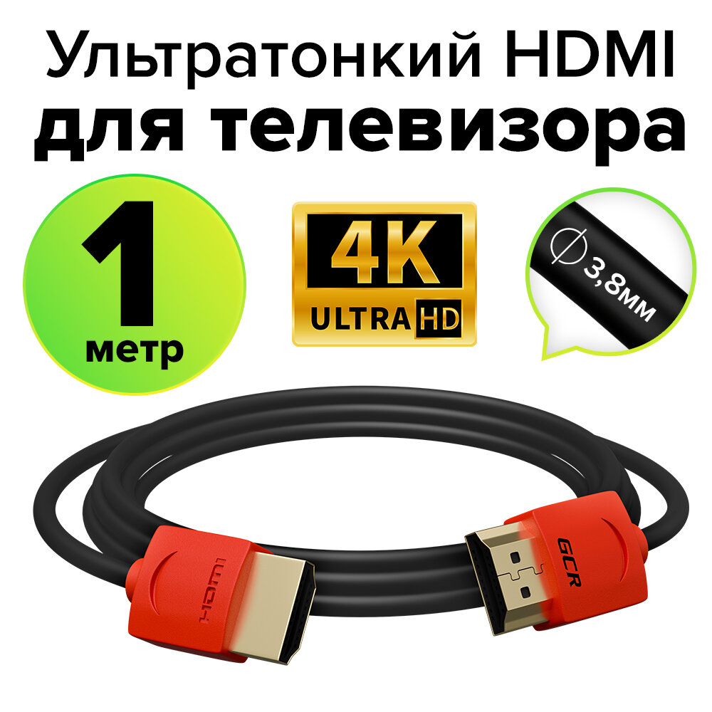 GCR Кабель SLIM 1.0m HDMI 2.0, красные коннекторы, OD3.8mm, HDR 4:2:0, Ultra HD, 4K 60 fps 60Hz, 3D, AUDIO, 18.0 Гбит/с, 30/30 AWG