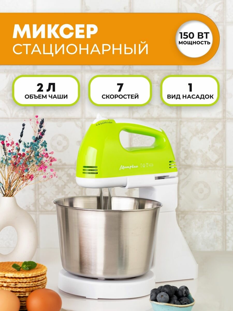 Миксер матрёна MA-015, стационарный, 150 Вт, 2 л, 7 скоростей, бело-зелёный Матрёна 6705273 .