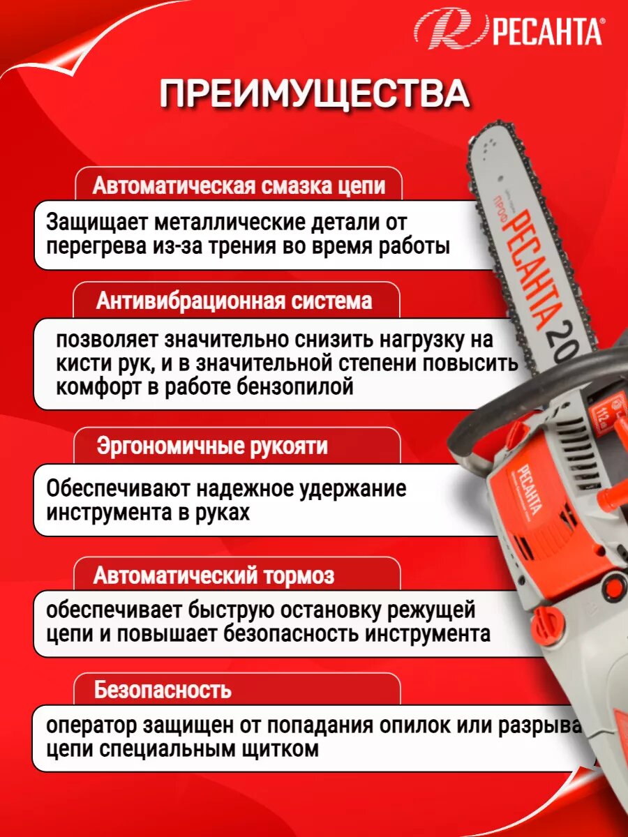 Бензопила Ресанта БП-6220 с мощностью 3300 Вт, объем двигателя 58 см3