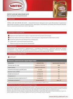 Синтетическое моторное масло SINTEC LUXE 10W-40 API SL/CF, 4 л, 4 кг