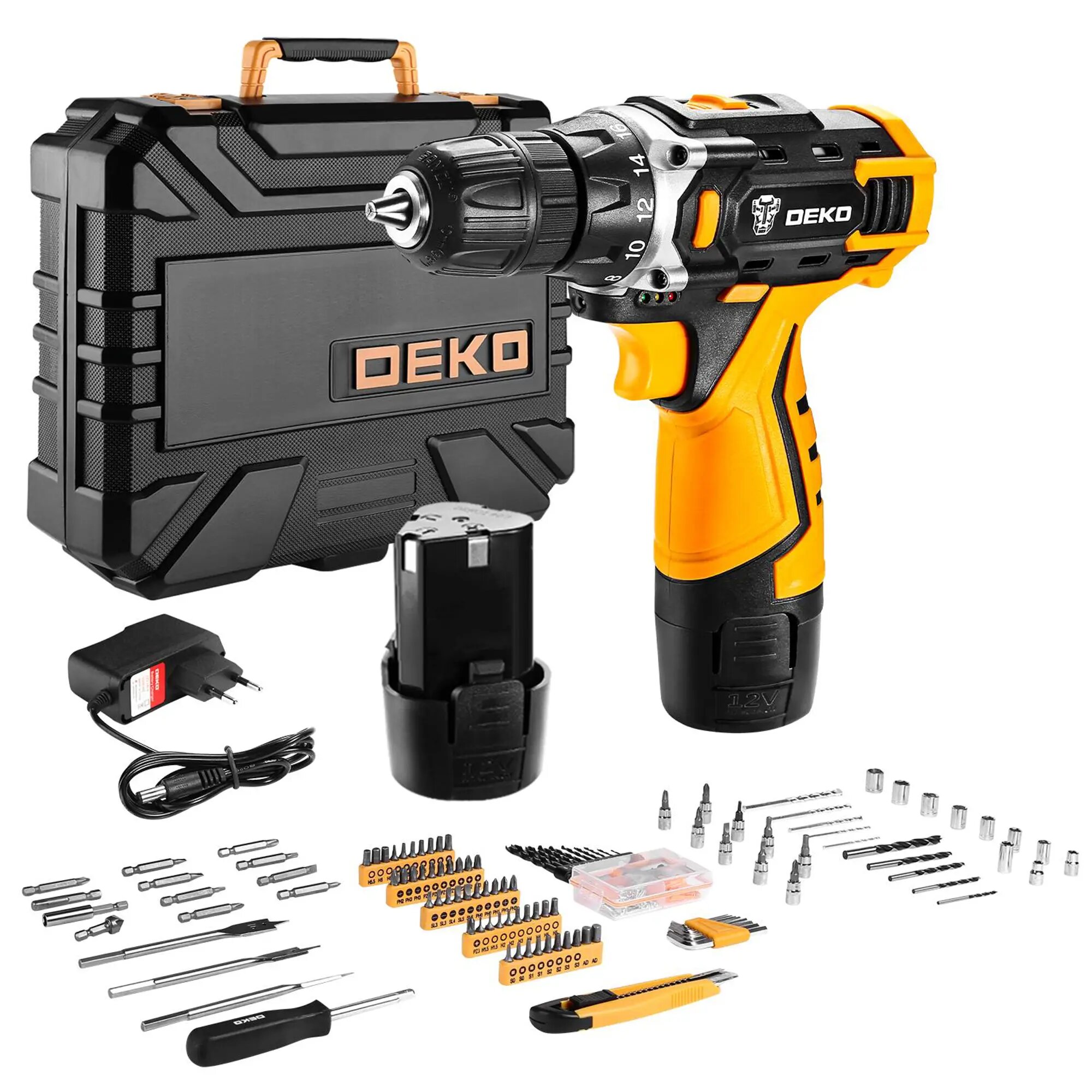 Дрель-шуруповерт аккумуляторная Deko DKCD12FU-Li 063-4139, 12 В Li-Ion 2x1.5 Ач с набором аксессуаров 193 шт