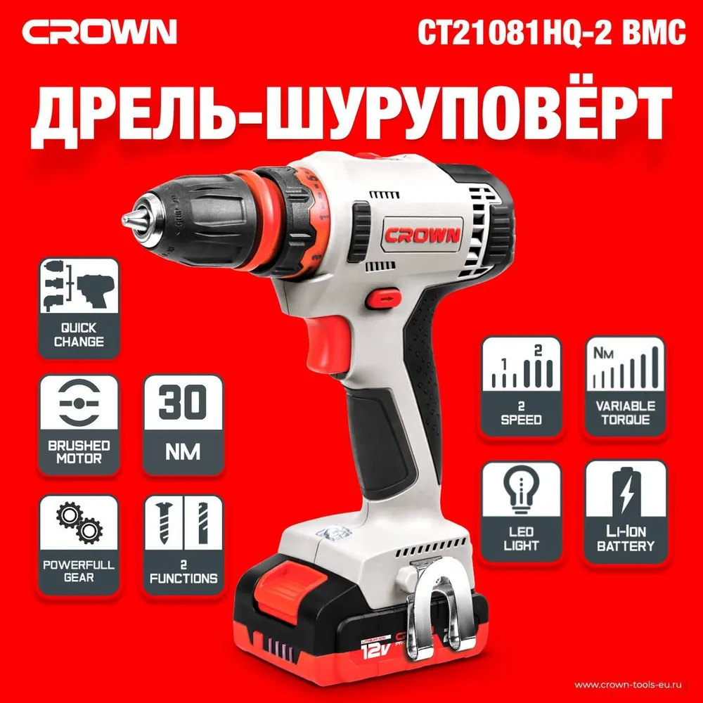 Аккумуляторная дрель шуруповерт CROWN CT21081HQ-2 BMC 12B, 30Нм, 2Aч, 2АКБ, + 2 насадки