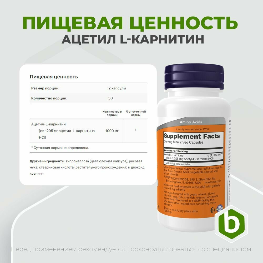 NOW ACETYL-L-CARNITINE 500 мг (100 вег.капс)