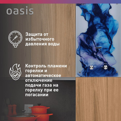 Газовая колонка Oasis Eco Glass B-20 Каменный цветок, 20 кВт, 10 л в м. Энергонезависимая Работа при пониженном давлении воды Электронное зажигание Сетчатый фильтр КПД 90% LCD дисплей