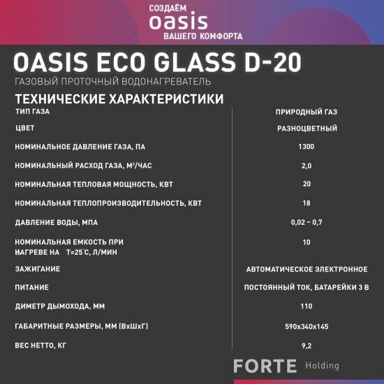 Водонагреватель газовый Oasis Eco (Zerten), проточный серия Glass K-20 кВт