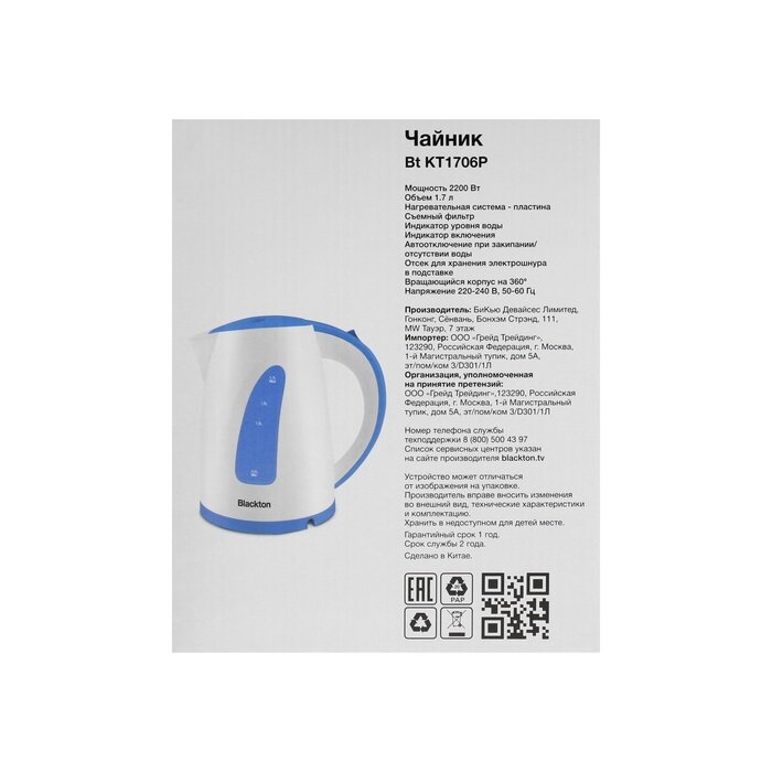 Купить Чайник электрический Blackton Bt Kt1706p 1.7л 2200Вт белый/синий