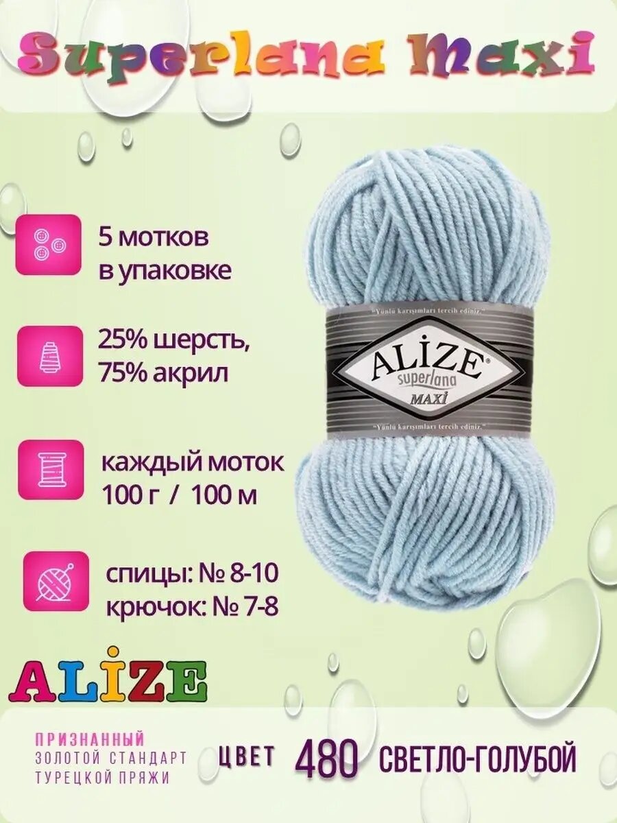 Купить Пряжа Alize Superlana Maxi светло-голубой (480), 25%шерсть/75%акрил, 100м, 100г, 5шт