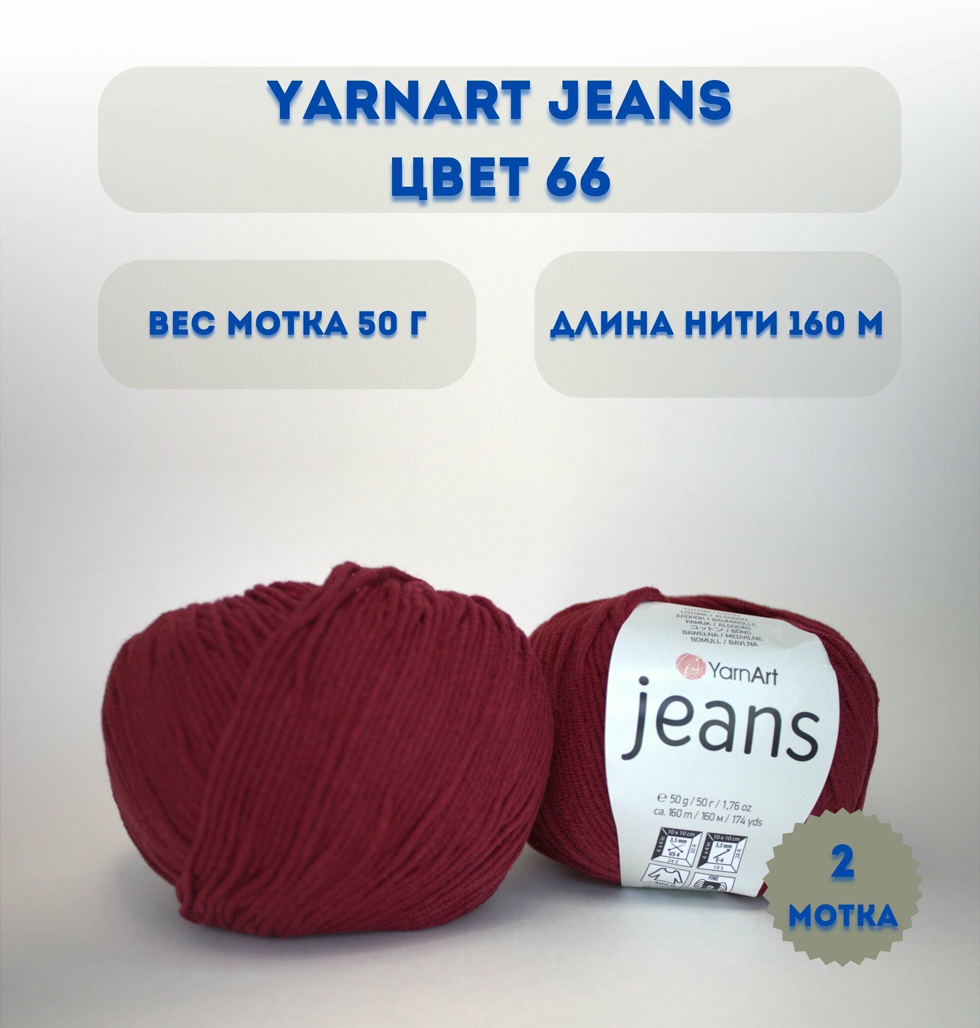 Купить Пряжа YarnArt Jeans, 2шт, (66 бордо), 55 % хлопок, 45 % акрил, 50 г, 160 м.