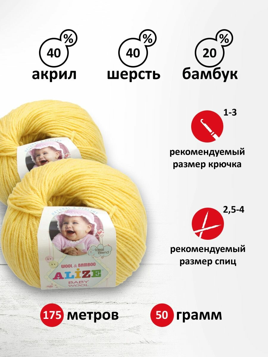 СохранитьПряжа Alize Baby Wool (Ализе Беби Вул) - 10 мотков Цвет: 187, Лимонный, 40% шерсть 20% бамбук 40% акрил, 50 г / 175 м интересное: