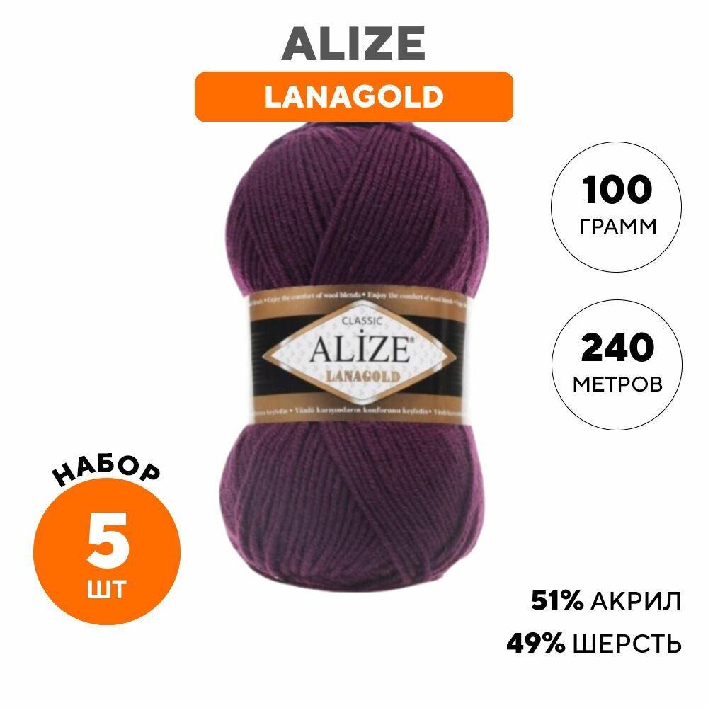 Пряжа для вязания Alize LanaGold (комплект 5 мотков), цвет: черника (215), состав: 51% - акрил, 49% - шерсть , вес: 100 гр, длина: 240 м