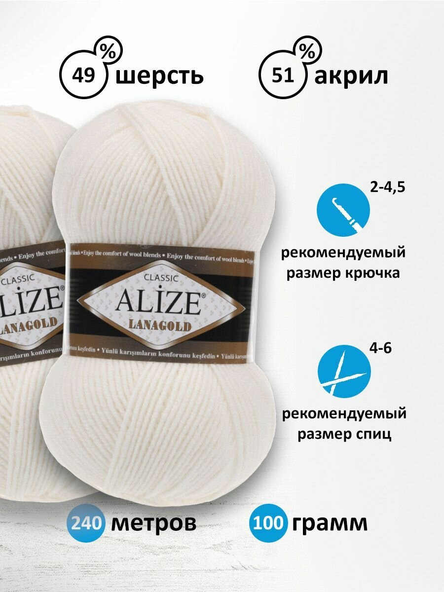 Пряжа Alize Lanagold (Ланаголд) цвет кремовый 01, 49% шерсть, 51% акрил 100г 240м 5шт.