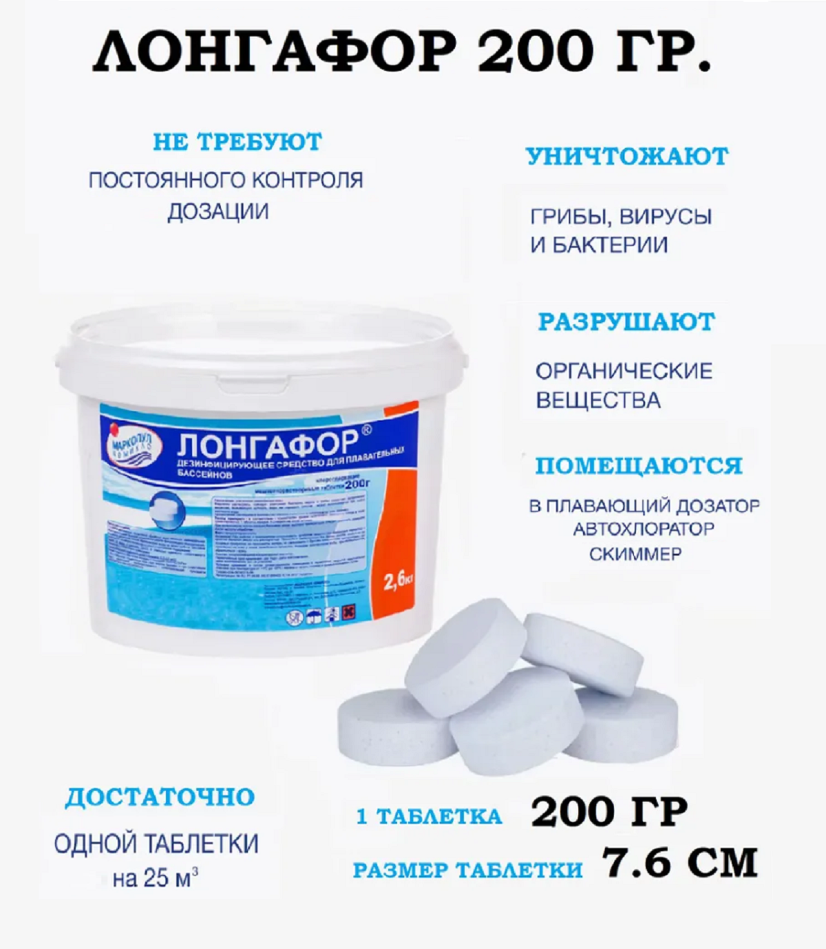 Маркопул Кемиклс Дезинфицирующее средство "Лонгафор", таблетки 200 г, для воды в бассейне, 1 кг