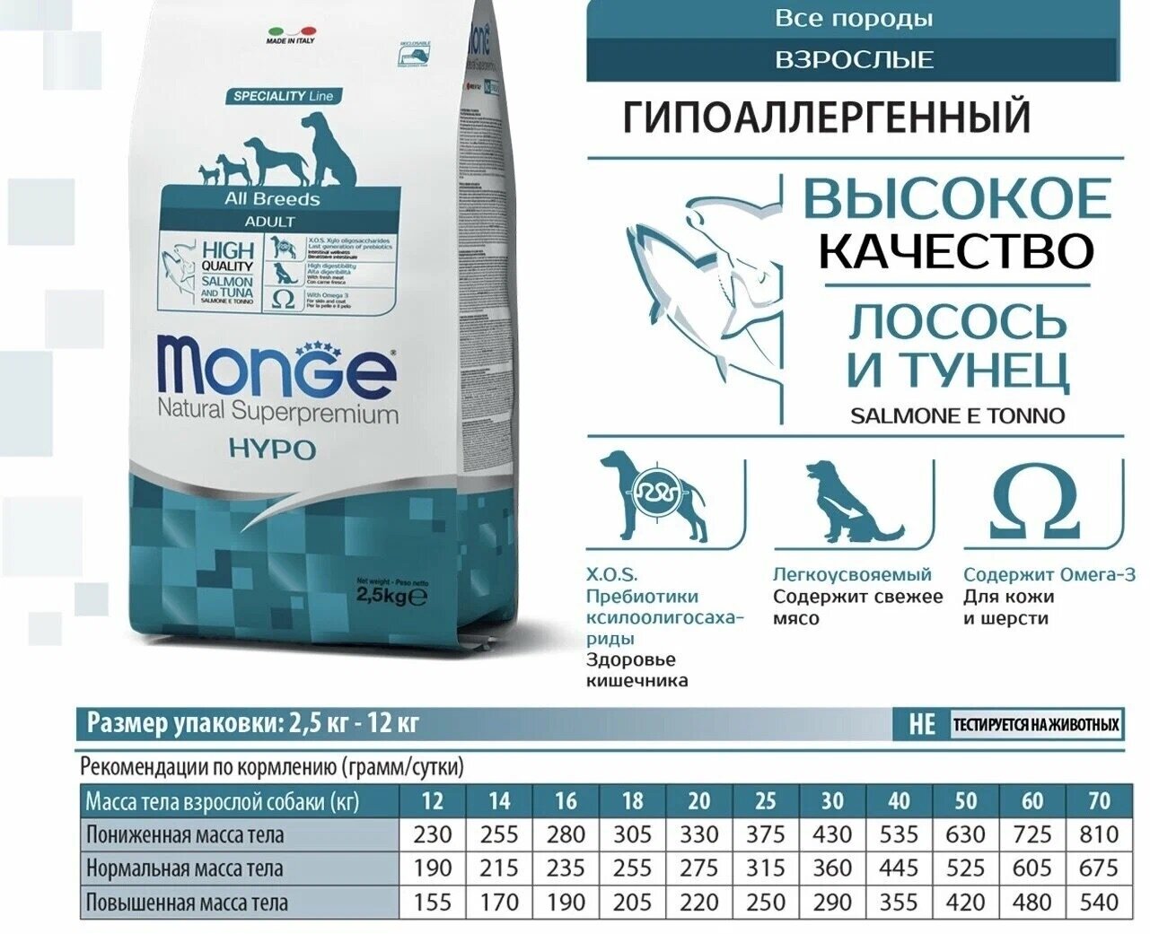 Корм Monge Speciality Line Hypo для взрослых собак всех пород, гипоаллергенный лосось с тунцом 12кг