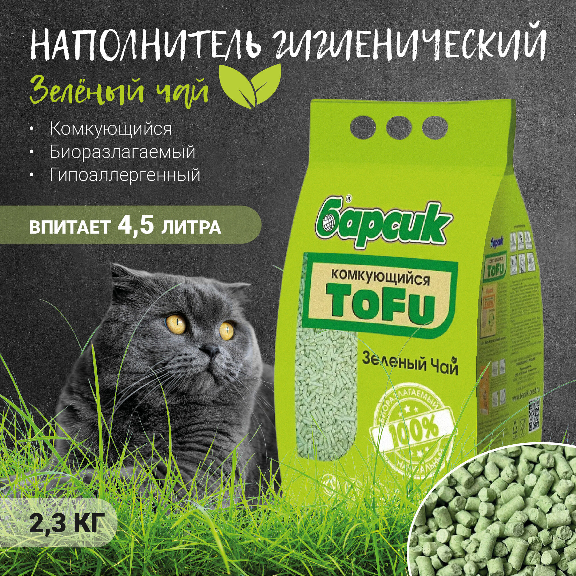 Барсик TOFU зелёный ЧАЙ наполнитель древесный комкующийся для туалета кошек (15 л)
