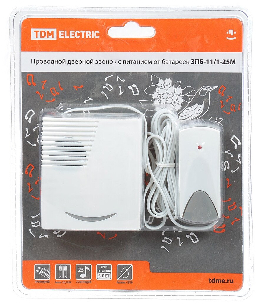 Звонок проводной на батарейках ЗПБ-11/1-25М (25 мелодий, кнопка IP30, 2х1,5В АА) TDM