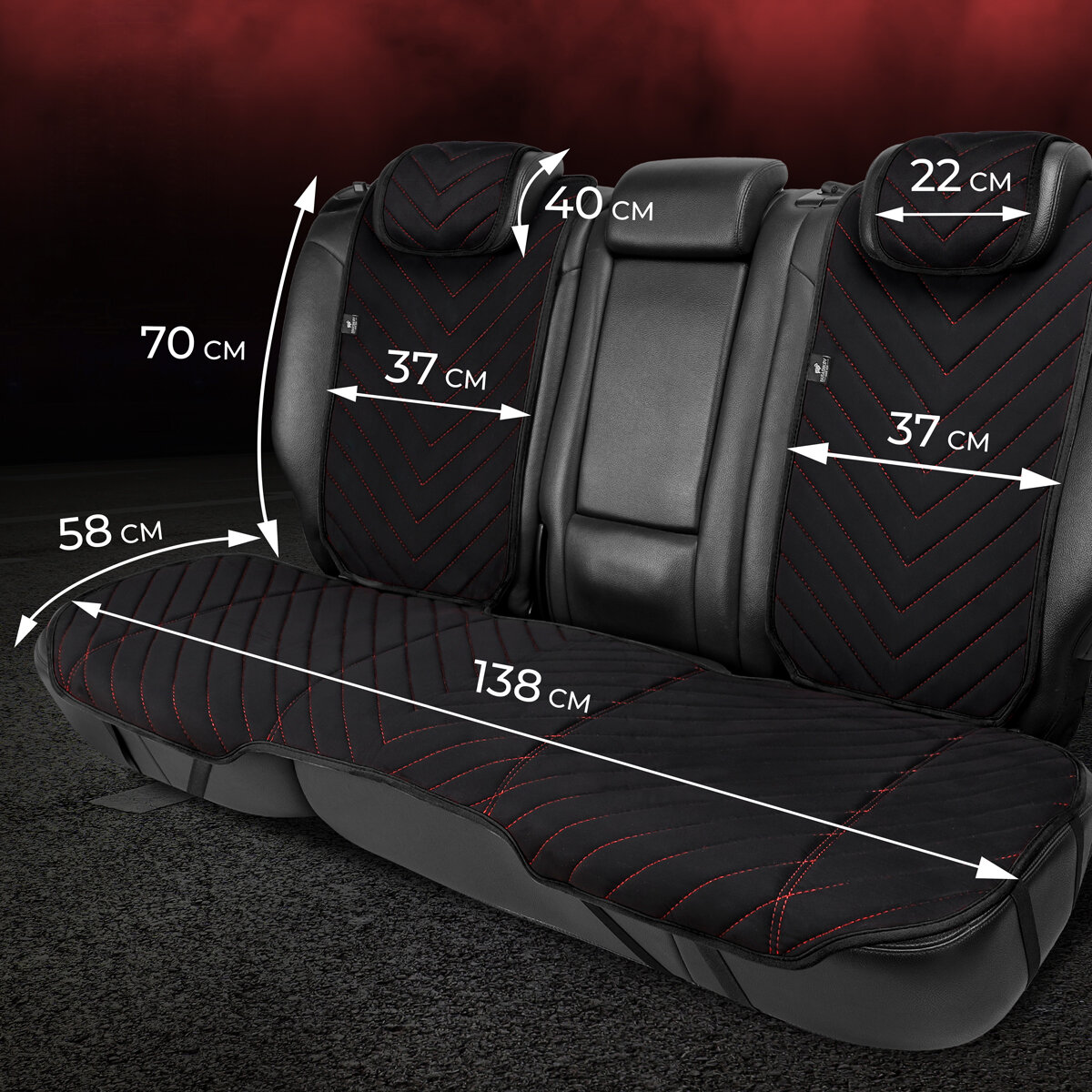 Полный комплект накидки из алькантары на сиденья автомобиля. Модель L SV PK. Чёрный/красный кант