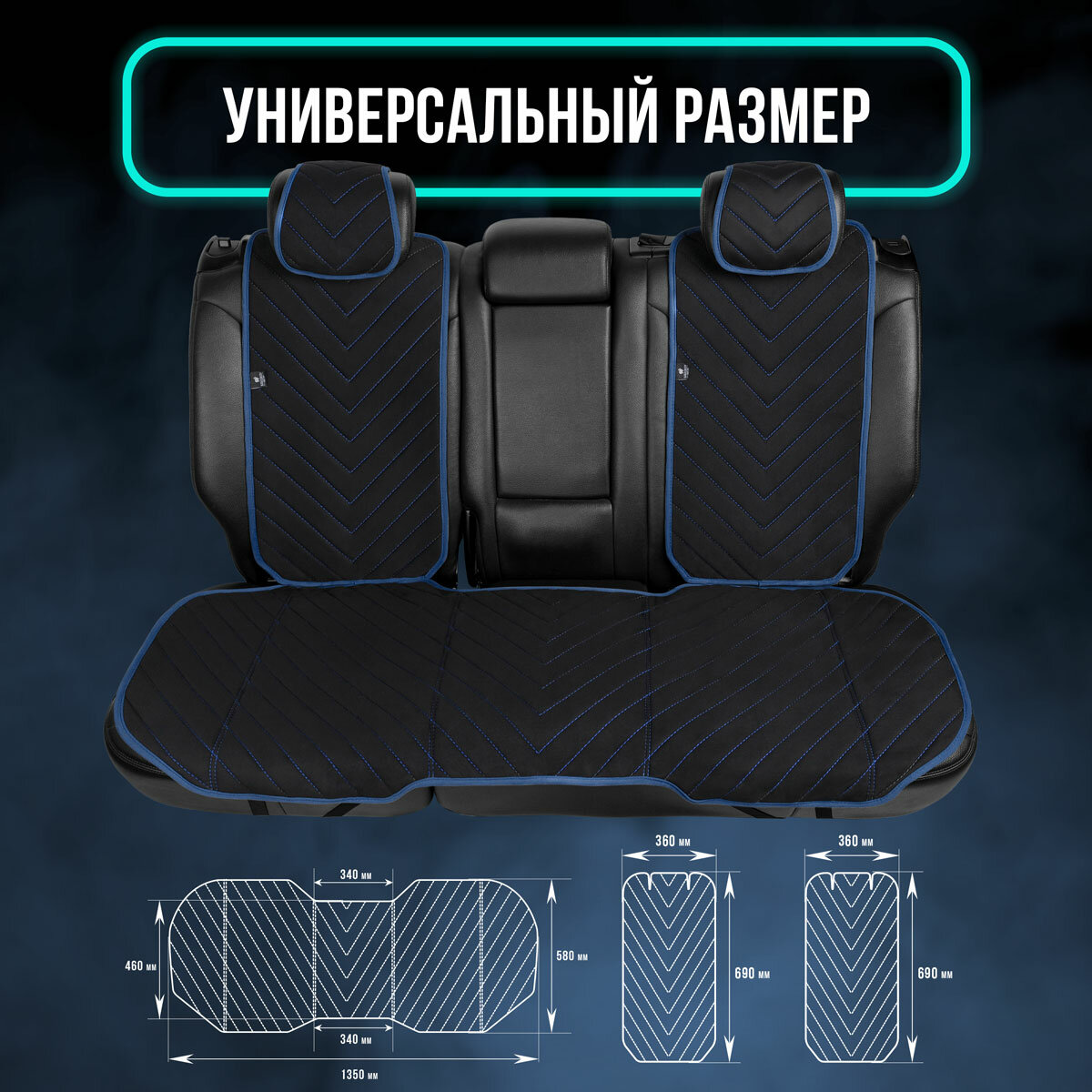 Полный комплект накидки из алькантары на сиденья автомобиля. Модель L SV PK. Чёрный/синий кант