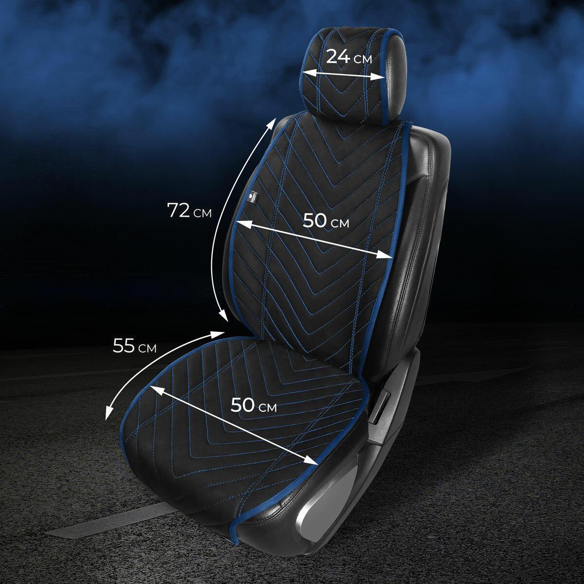 Пара накидок из алькантары на переднее сиденье автомобиля. Модель L SV. Черный/синий кант