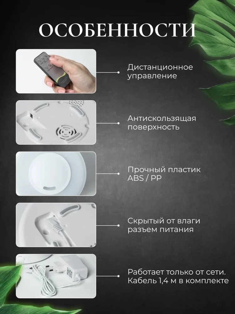 | Дополнительная информация | Встроенная Bluetooth - колонка, автоматическое отключение при отсутствии воды, бесшумный, 7 цветов расцветки RGB, 7 ночных цветов освещения |