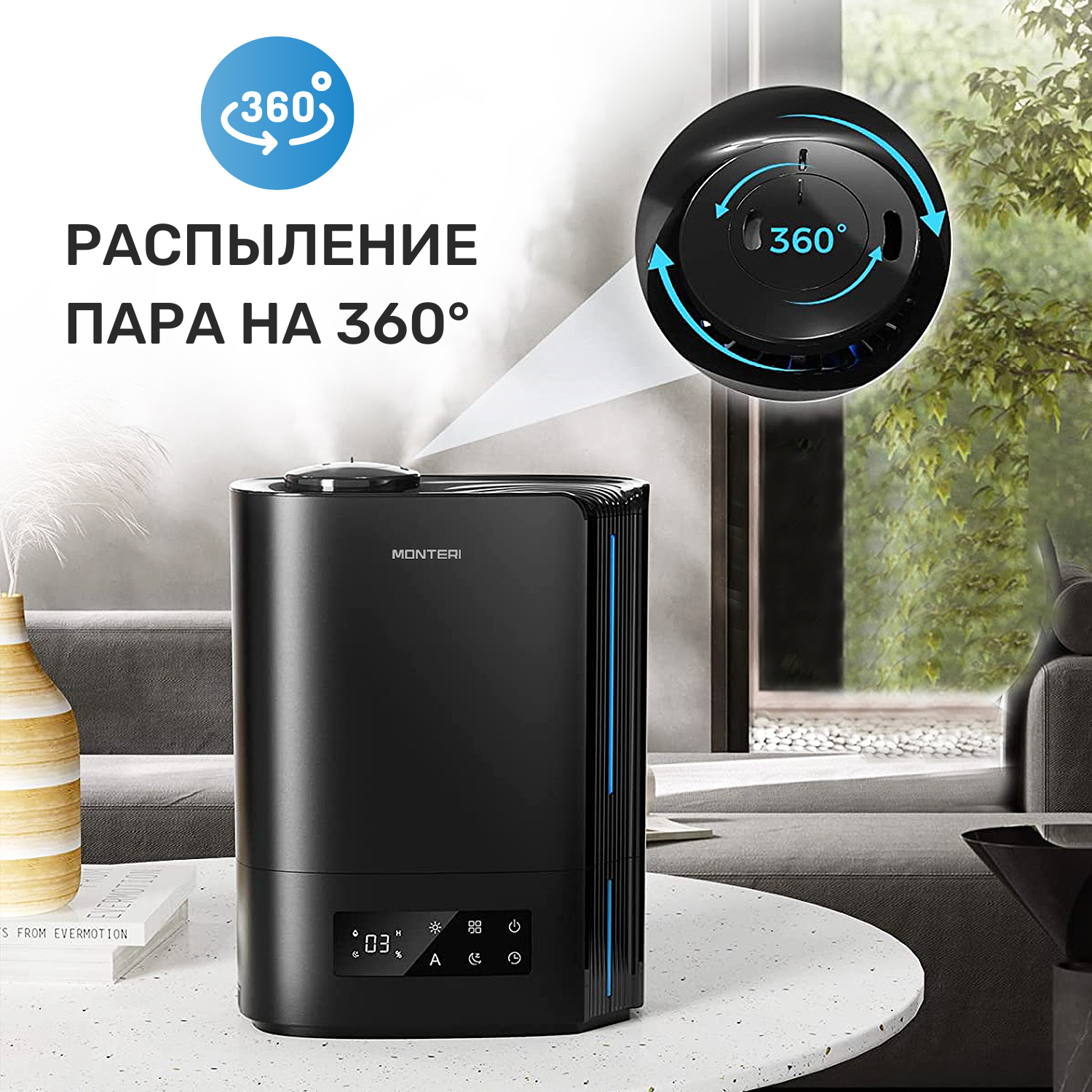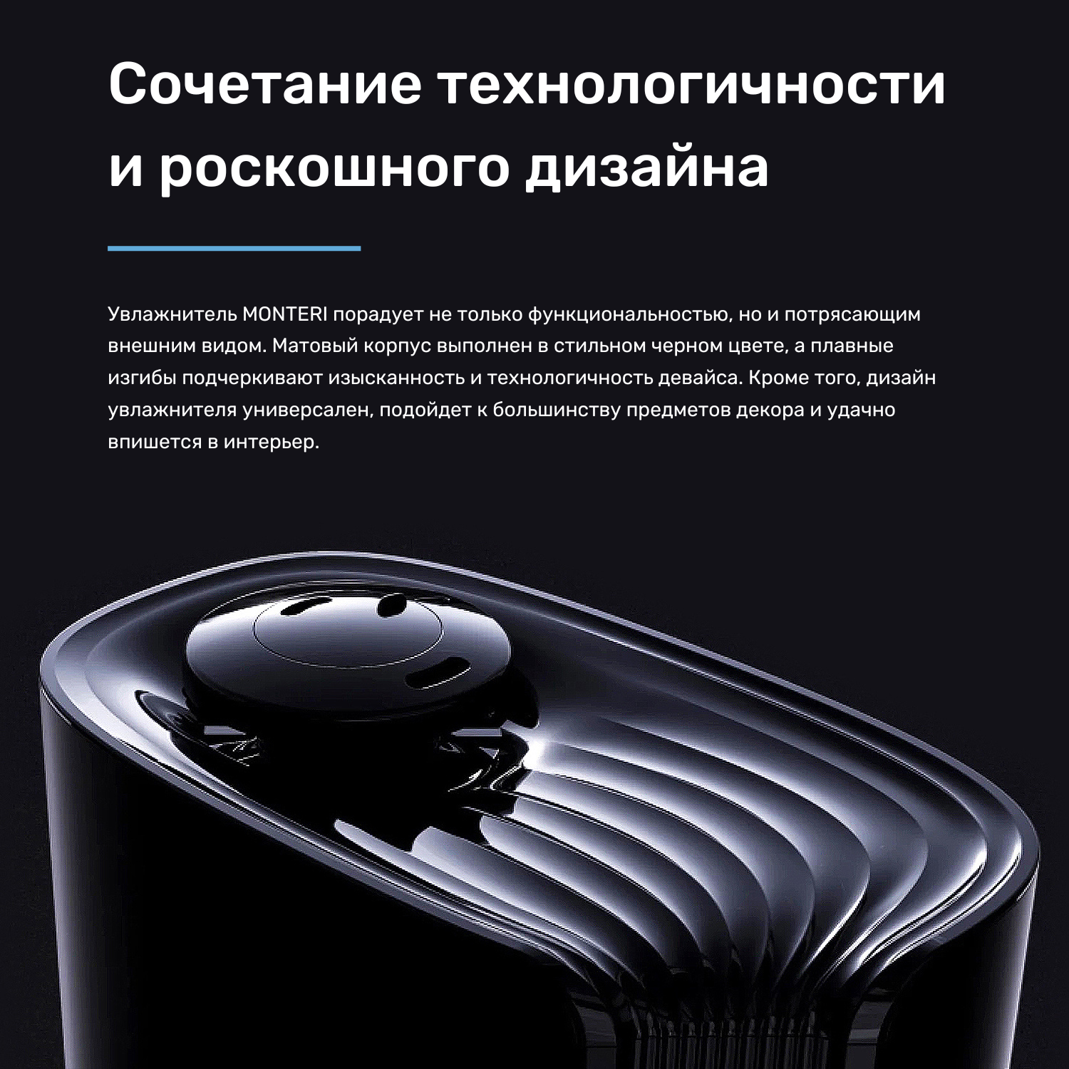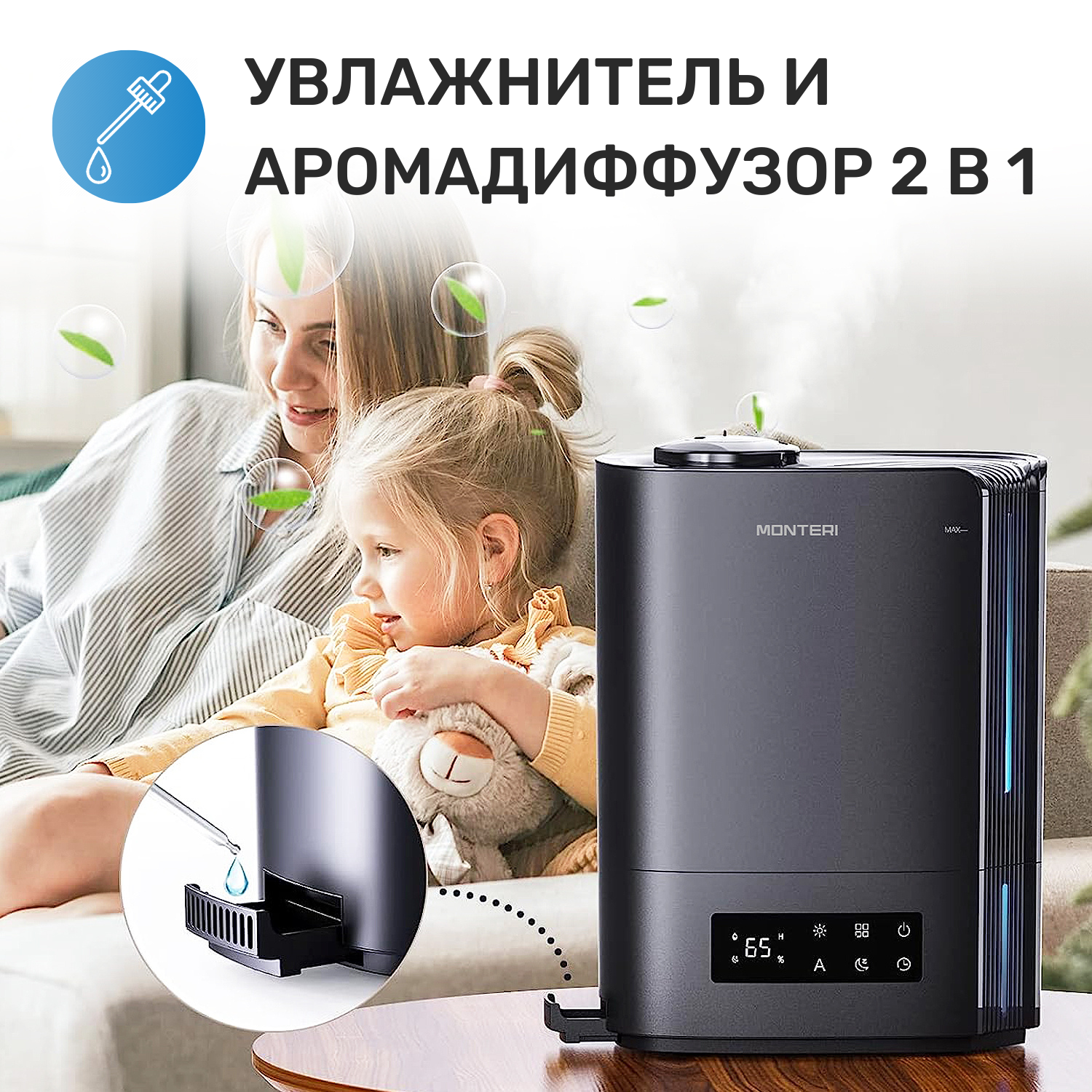 Увлажнитель воздуха для дома с аромадиффузором MONTERI Wasser B25, черный с подсветкой, ультразвуковой воздухоувлажнитель с верхним заливом, тихий пароувлажнитель в детскую комнату интересное: