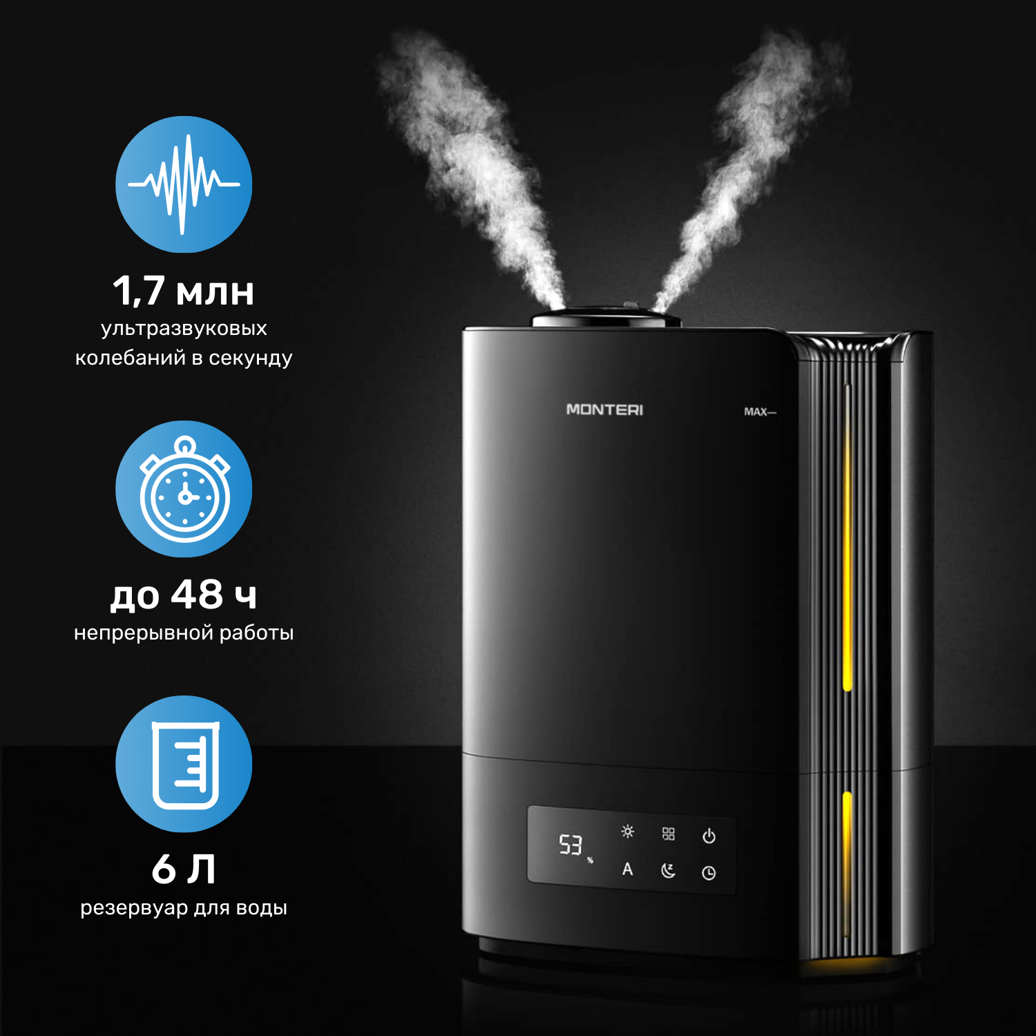 Купить Увлажнитель воздуха для дома с аромадиффузором MONTERI Wasser B25, черный с подсветкой, ультразвуковой воздухоувлажнитель с верхним заливом, тихий пароувлажнитель в детскую комнату