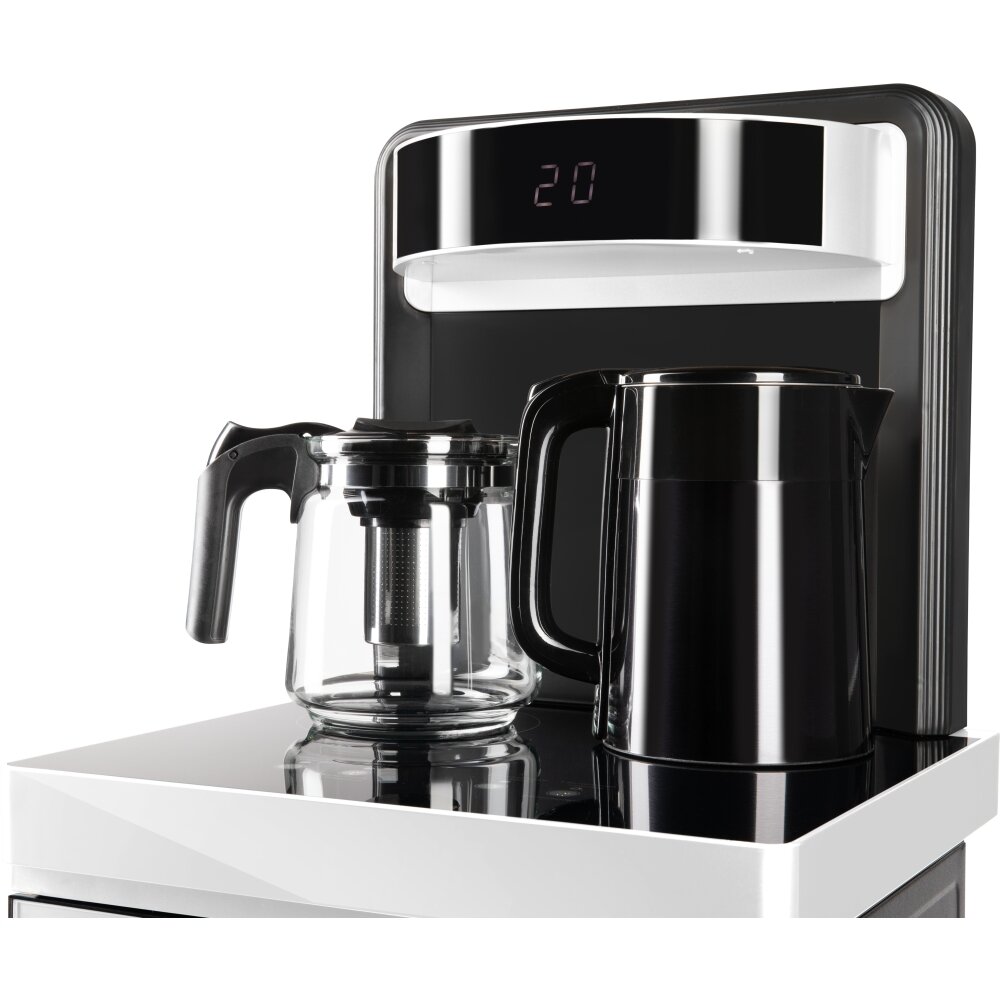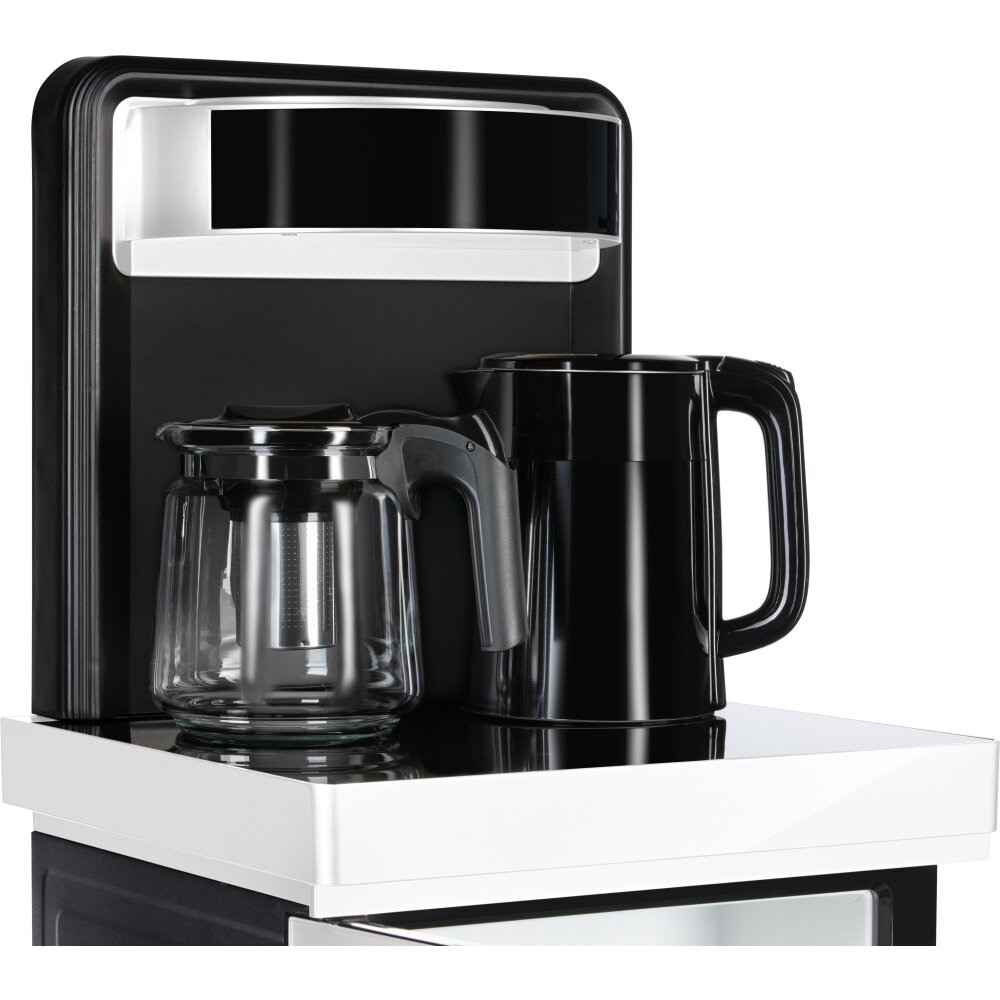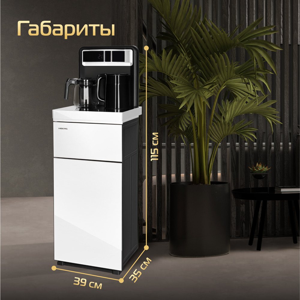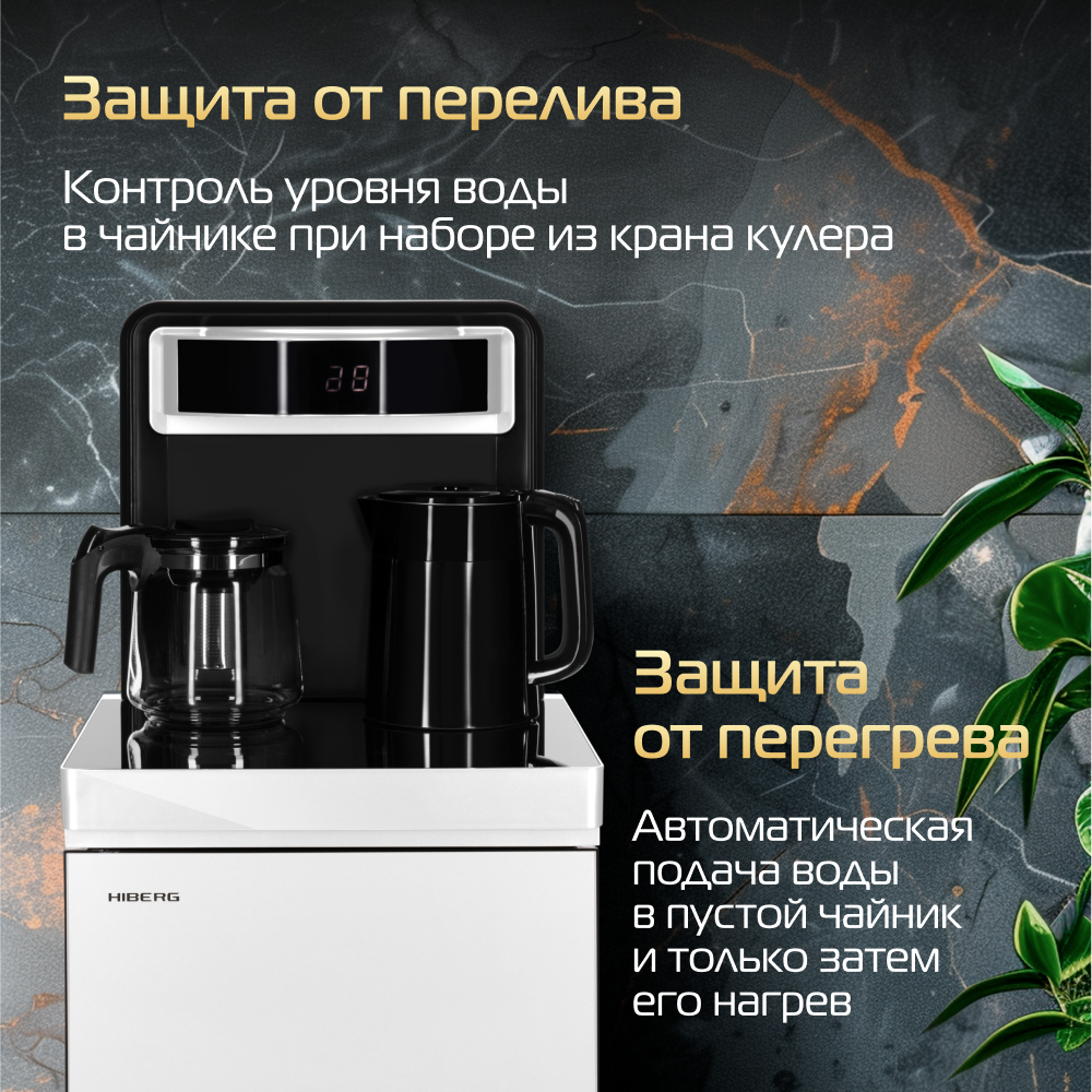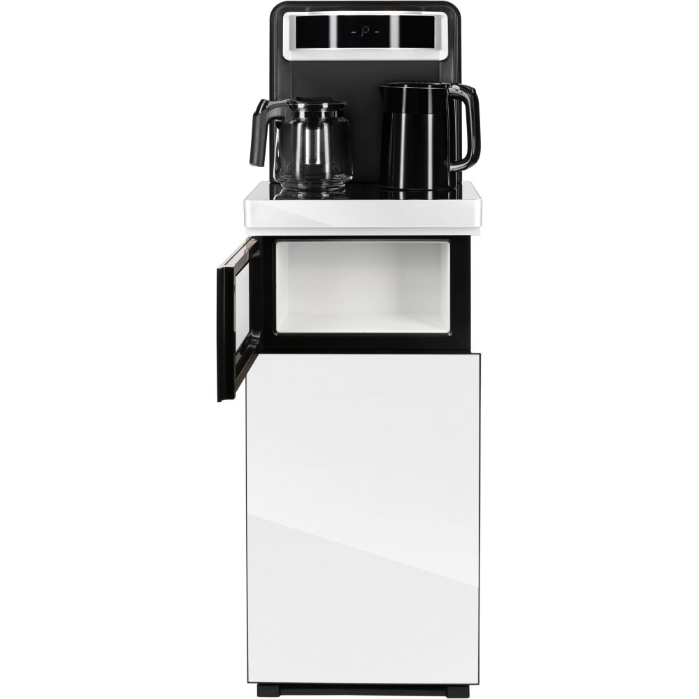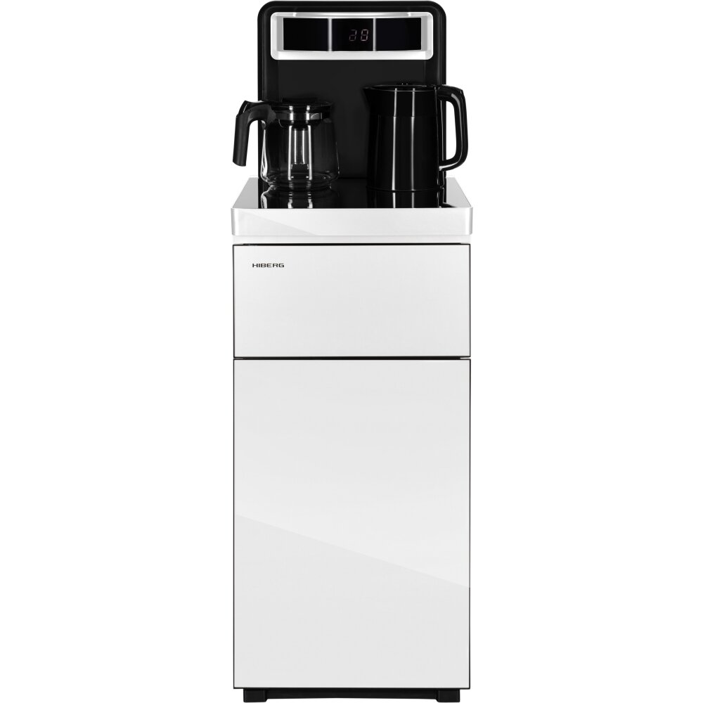 Кулер для воды HIBERG UF 95 W напольный, электронное охлаждение, столешница с двумя чайниками, нижняя загрузка бутыли, сенсорное управление, цвет белое стекло