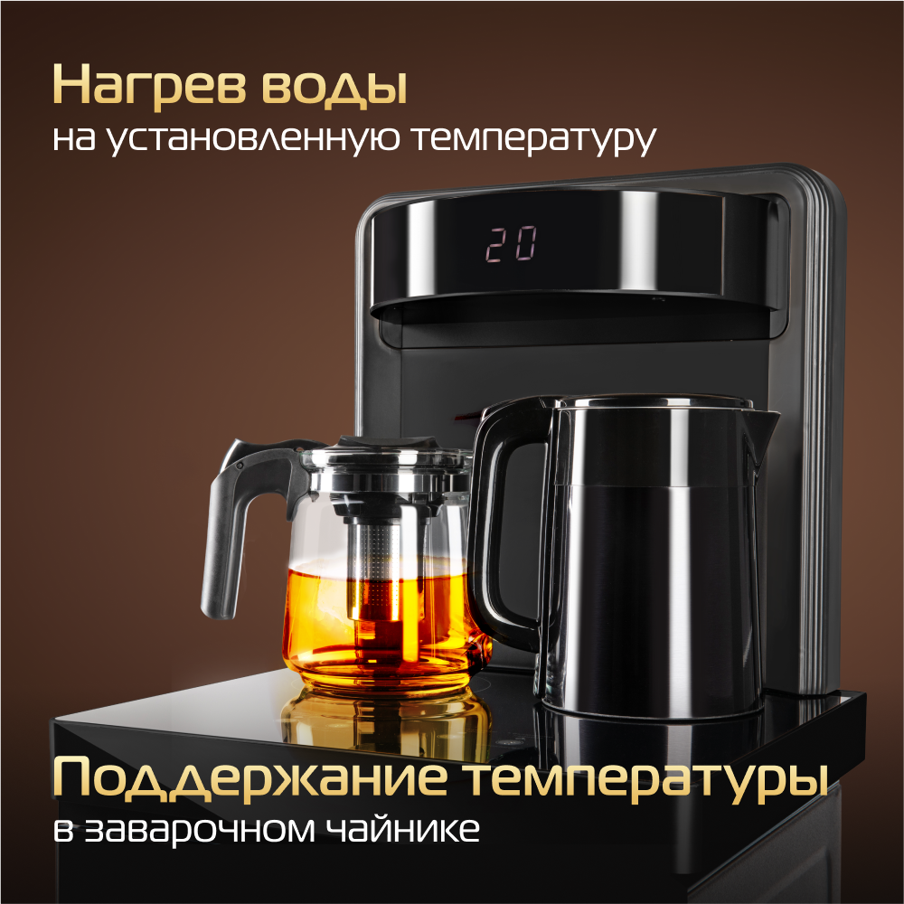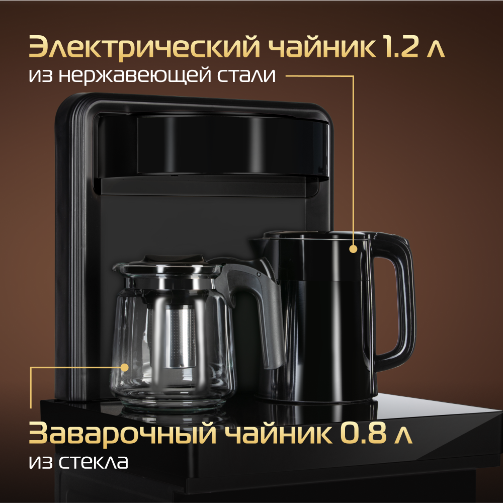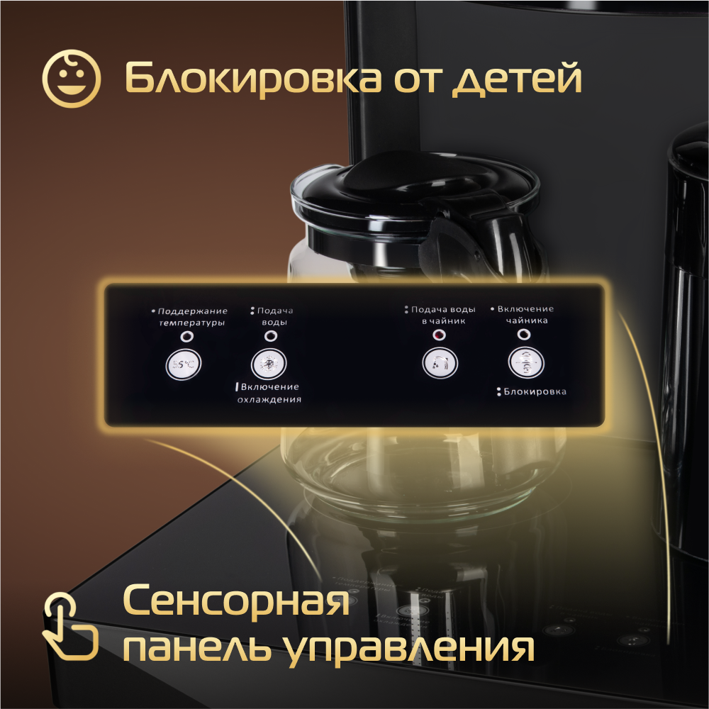 Кулер для воды HIBERG UF 95 Gold напольный, электронное охлаждение, столешница с двумя чайниками, нижняя загрузка бутыли, сенсорное управление, цвет золотистый