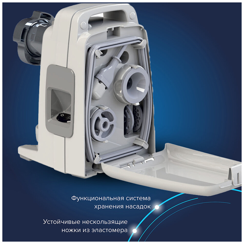 | Особенности | защита от перегрузки, отсек для сетевого шнура, отсек для хранения насадок, прорезиненные ножки |