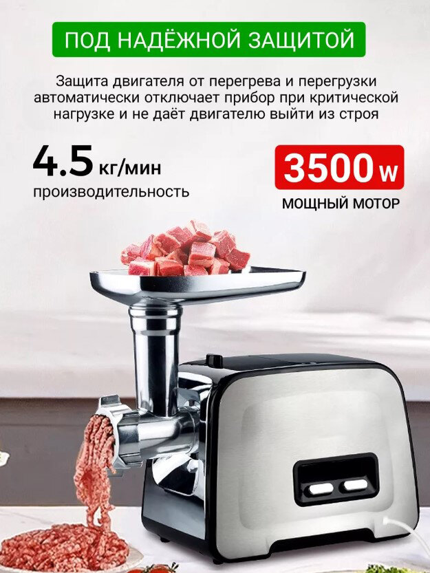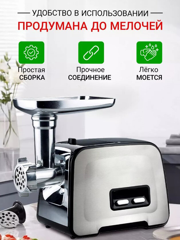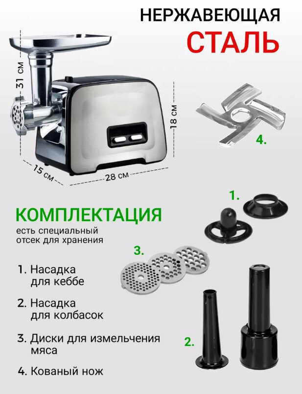 | Насадки | диск для фарша / насадка для кеббе / насадка для приготовления колбас |