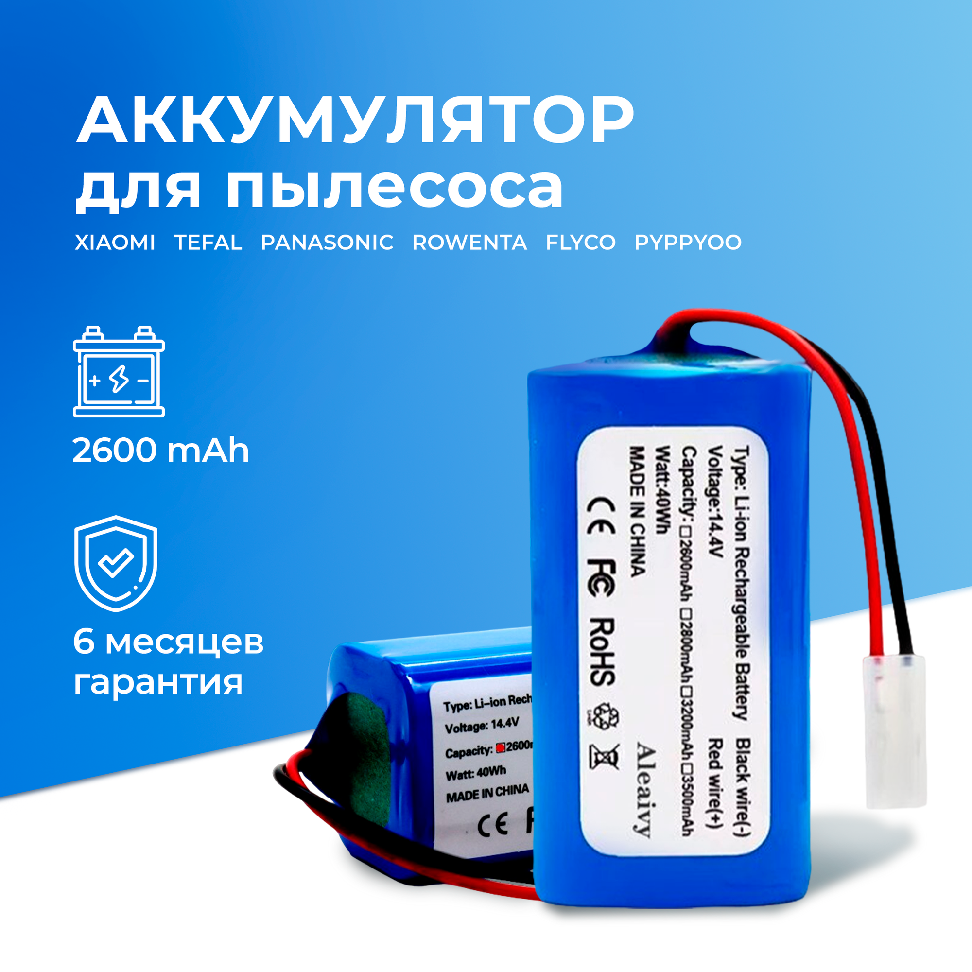 | Совместимые модели | H18650CH-4S1P, Xiaomi Mijia G1, MJSTG1, SKV4136GL, Panasonic MC-WRC53, Phicomm X3, Puppyoo R30, Puppyoo R30 Pro, Puppyoo R35, Puppyoo WP650, FLYCO FC9601, FLYCO FC9602, Rowenta RR6825 EXPLORER SERIES 20, RR6871, RR6875, RR6925 SMART FORCE ESSENTIAL, RR6926, RR6927, RR6933, RR6943, RR6971, RR6976, RR7245 EXPLORER SERIES 40, RR7255, RR7267, RR7275, RR7427 EXPLORER SERIES 60, RR7447, RR7455, Tefal RG6825 EXPLORER SERIES 20, Tefal RG6825WH, RG6871, RG6875, RG6971, RG7267 EXPLORER SERIES 40, RG7275 SMART FORCE ESSENTIAL, Tefal RG7447 EXPLORER SERIES 60, RG7455, RG7455WH, RS-2230001696, UPCAN X3 R2, Xiaomi Mi Robot Vacuum Mop Essential - SKV4136GL / MJSTG1, Xiaomi Mijia Essential G1 MJSTG1 - SKV4135CN, XROBOT M-788A |