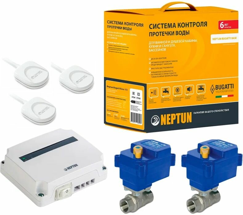 | Подробная комплектация | Модуль управления Neptun Base - 1 шт; Датчик Нептун SW 005 2.0 - 3 шт; Кран шаровой с электроприводом Bugatti Pro 220В - 2 шт |