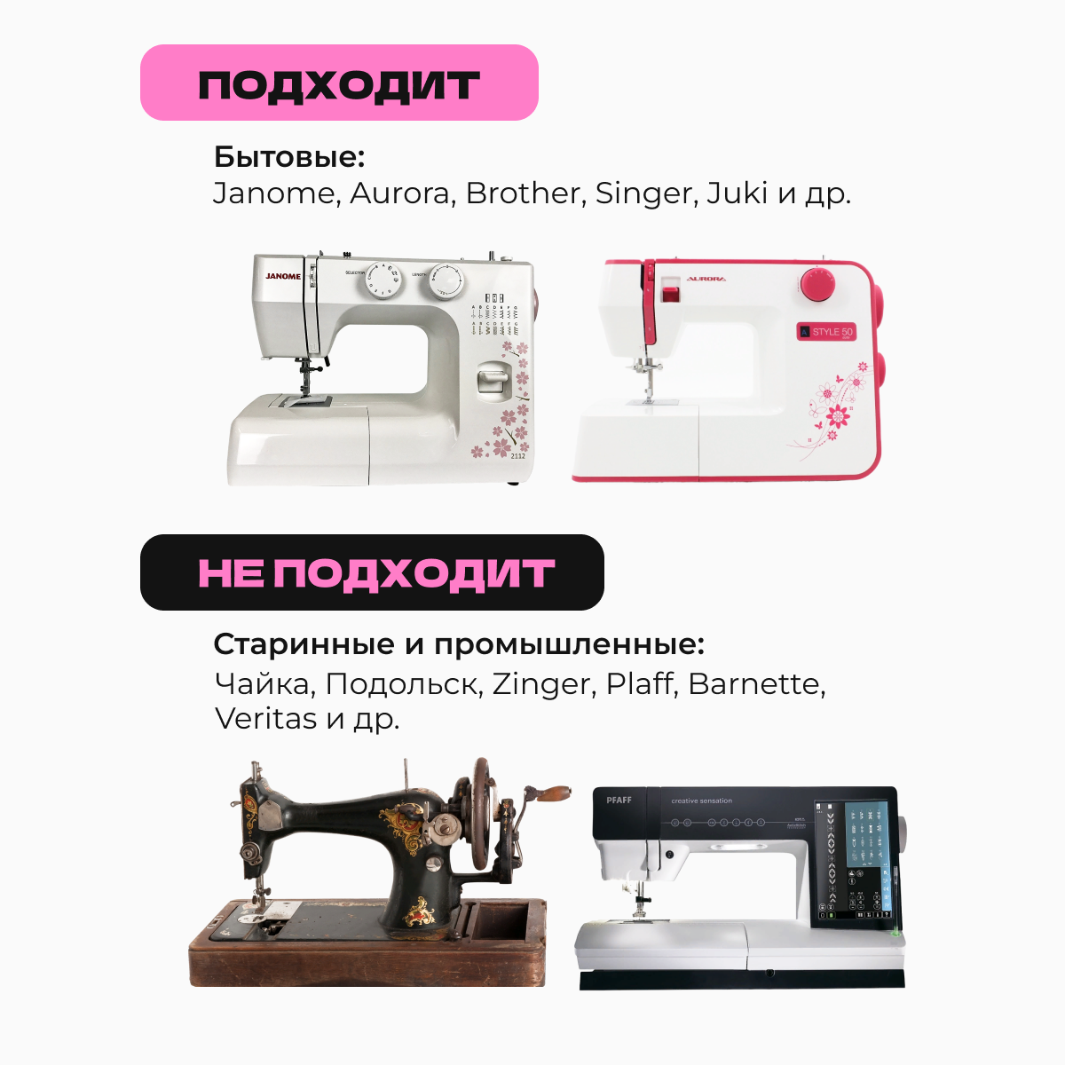 | Совместимость | Данный набор лапок подходит для большинства бытовых швейных машин, таких как: Janome, Brother, Juki, Toyota, Jaguar, Astralux, Aurora, Pfaff Hobby, Bernina, Bernette, Dragonfly, Elna, Husqvarna, Comfort, Veritas и др |