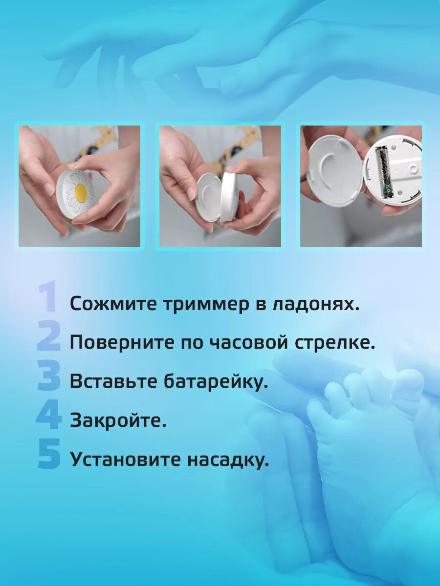 | Дополнительная информация | 1. Установите 1 батарею AAA, закройте крышку. 2. Выберите соответствующую шлифовальную головку в соответствии с возрастом. Подключите шлифовальную головку и интерфейс. 3. Нажмите кнопку вращения. 4. Аккуратно обрежьте ногти до достижения желаемой длины. Примечание: аккумулятор в комплект не входит. Снимите батарейки, если вы не хотите использовать их в течение длительного времени. Храните пилку для ногтей и аксессуары в чехле. Пожалуйста, держите подальше от детей. |