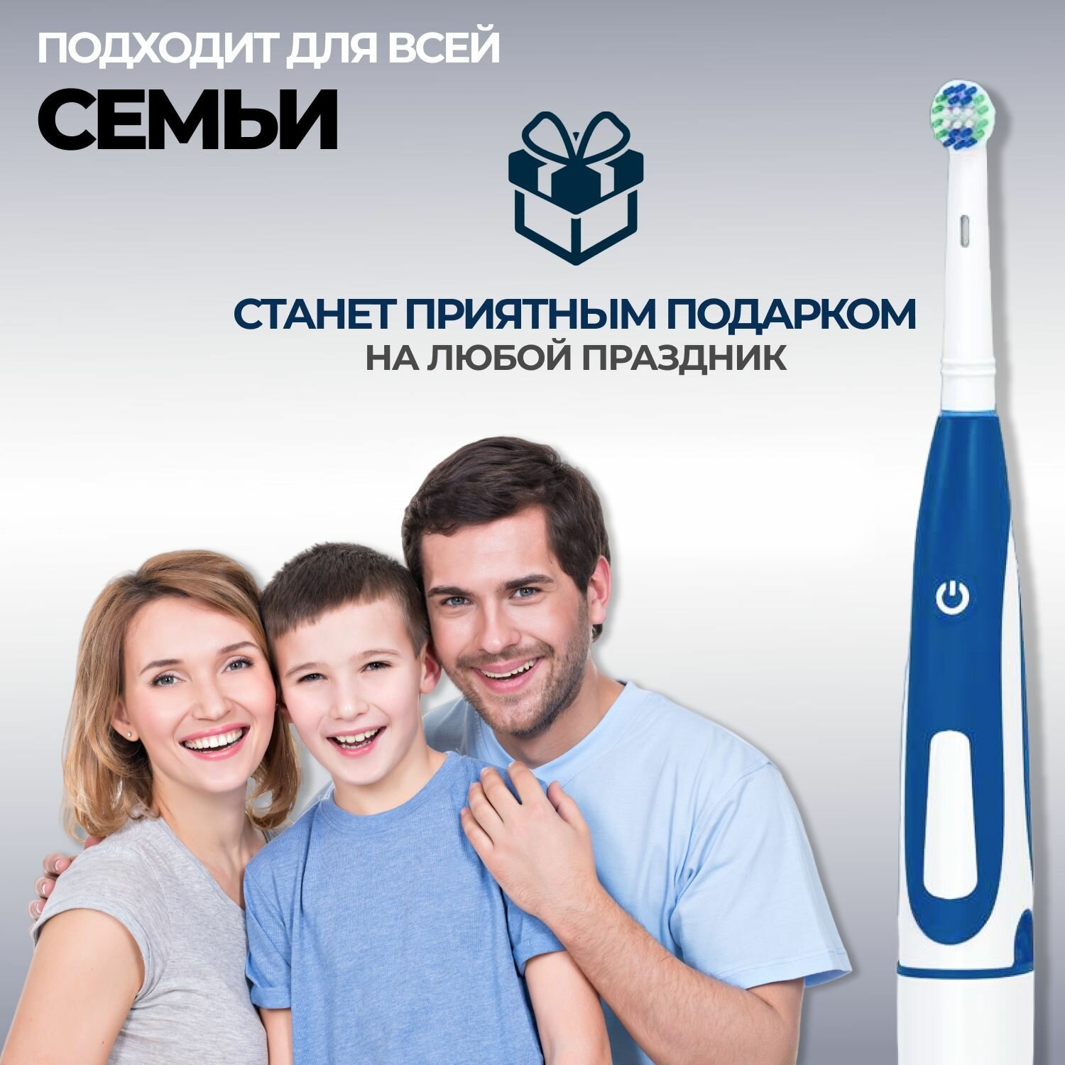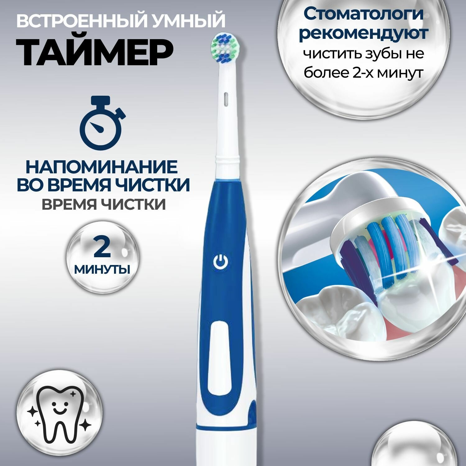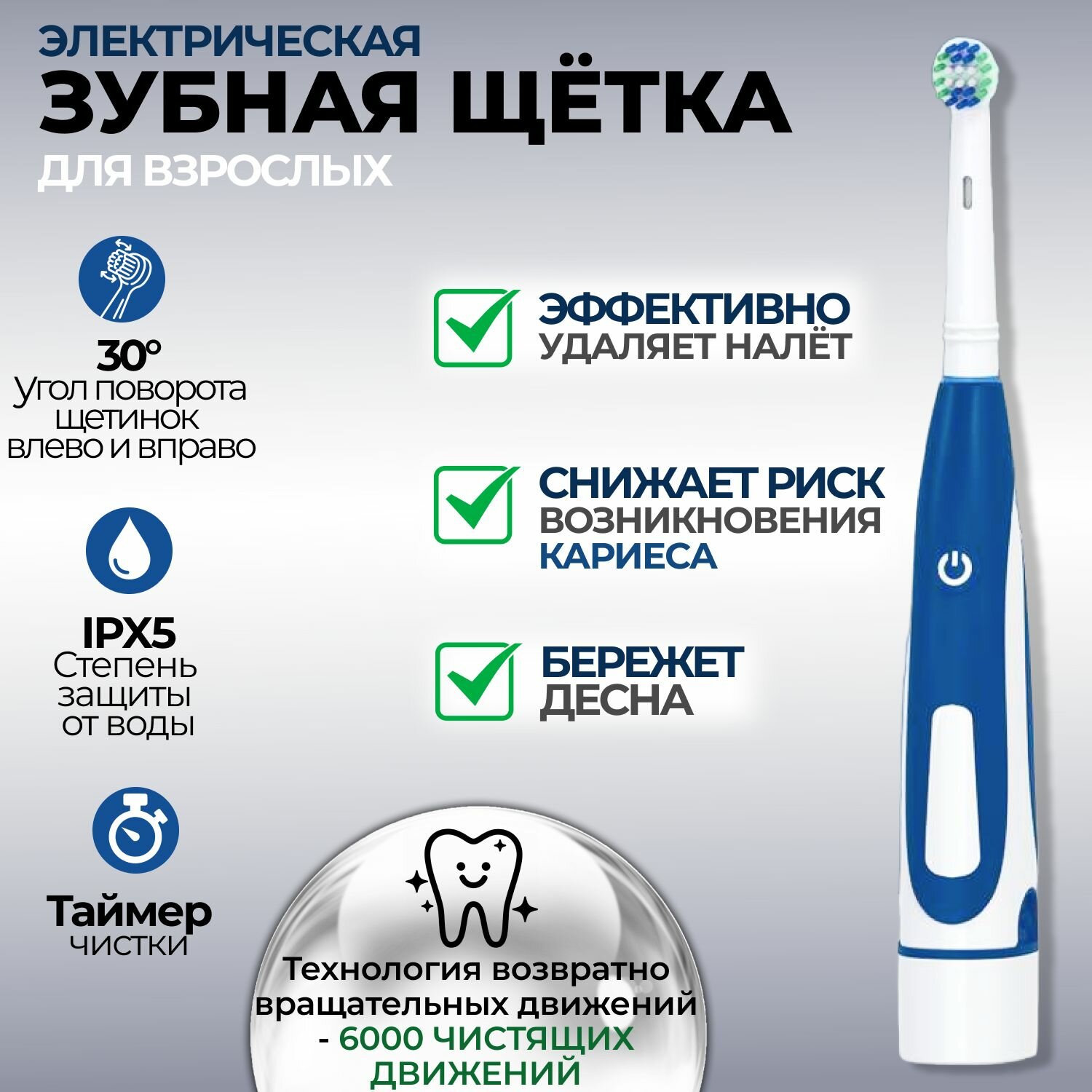 Электрическая зубная щетка взрослая Biksi, с 2 насадками, от 2 батареек АА, синий интересное: