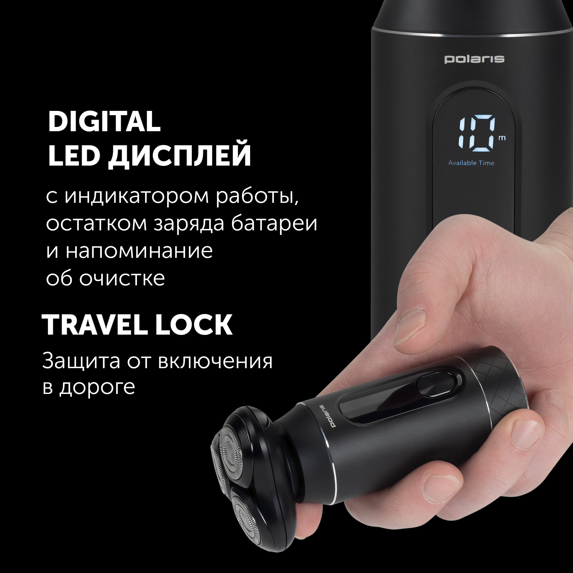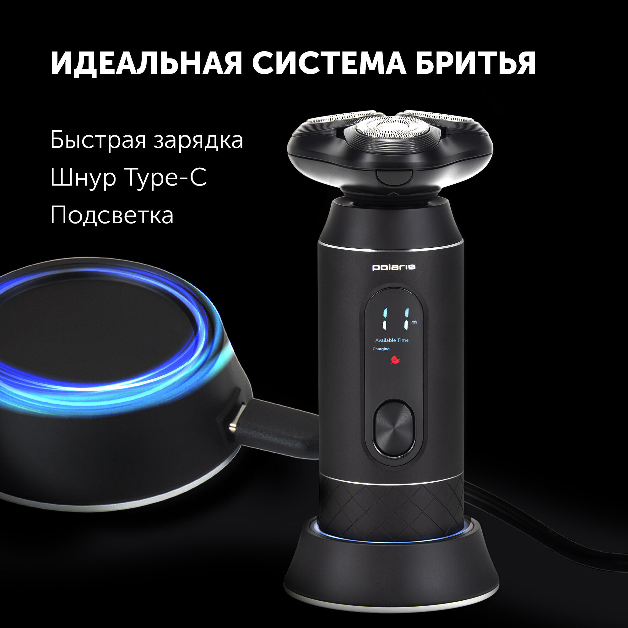 Бритва роторная Polaris PMR 0724RC реж.эл.:3 питан.:элек.сеть/аккум. черный интересное: