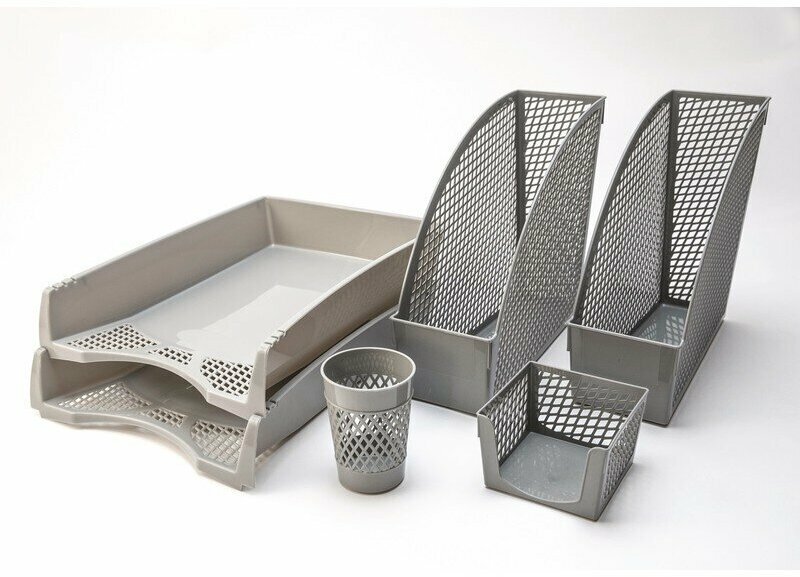 | В комплекте | 2 горизонтальных лотка для бумаг 34×27×7.1 см, 2 вертикальных накопителя 25.5×11×25 см, подставка для письменных принадлежностей 7.4×5.5×10 см, подставка для бумажного блока 10×10×6.8 см |