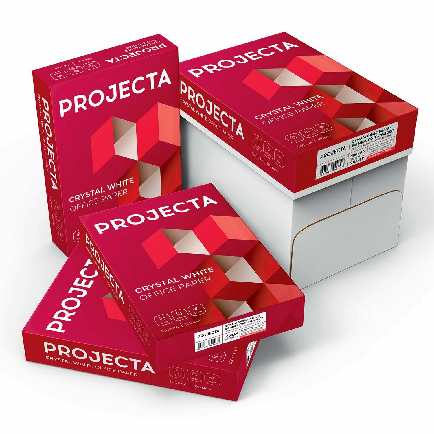 Комплект 4 шт, Бумага офисная А4, 80 г/м2, 500 л., марка А, PROJECTA, 168% (CIE)