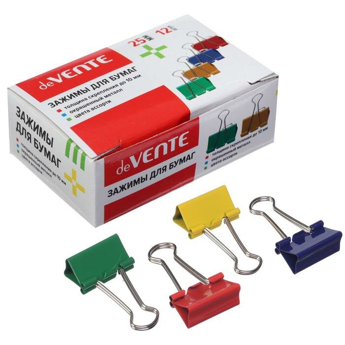 Зажимы для бумаг 25 мм, 12 штук, deVENTE, металлические, микс х 4 цвета, картонная коробка интересное: