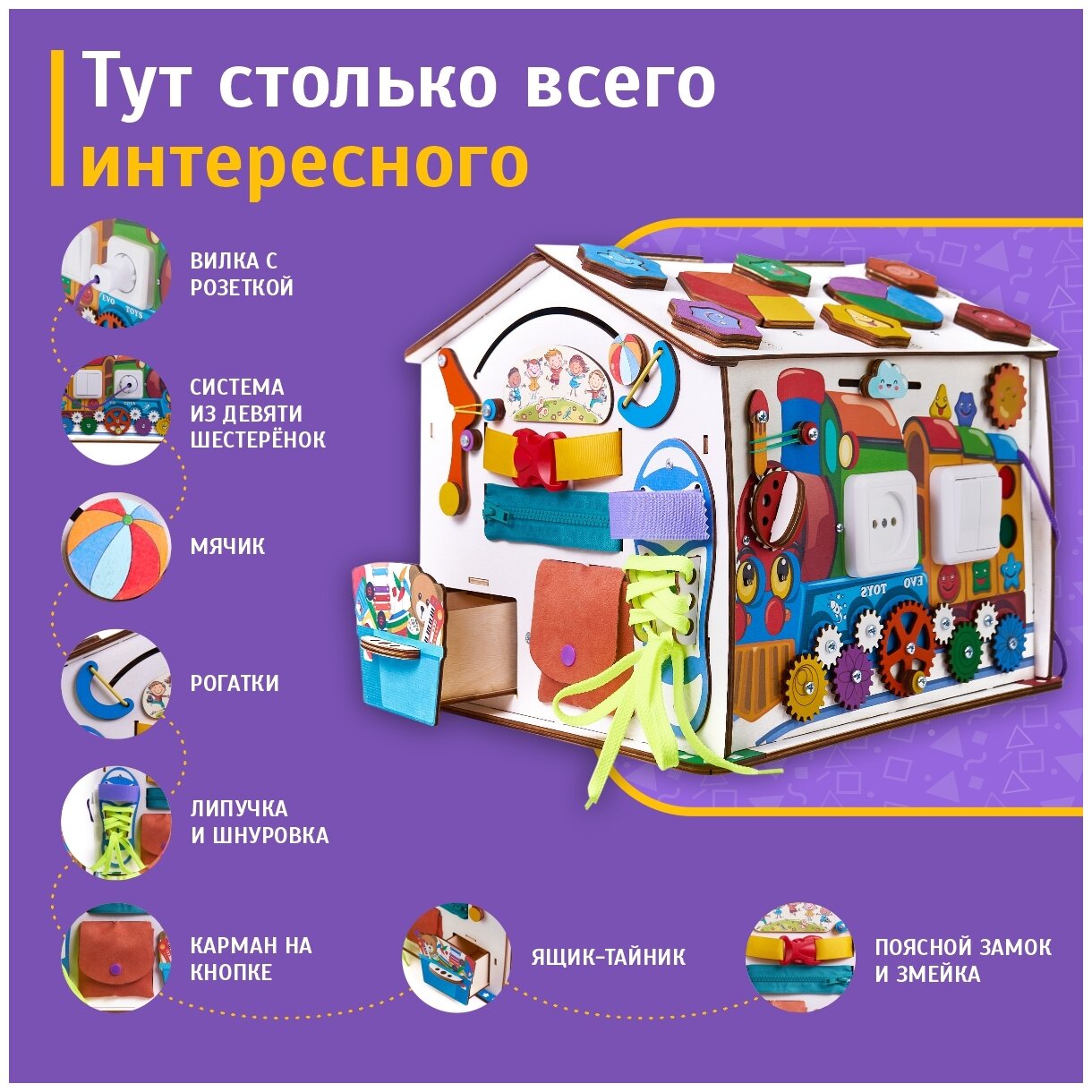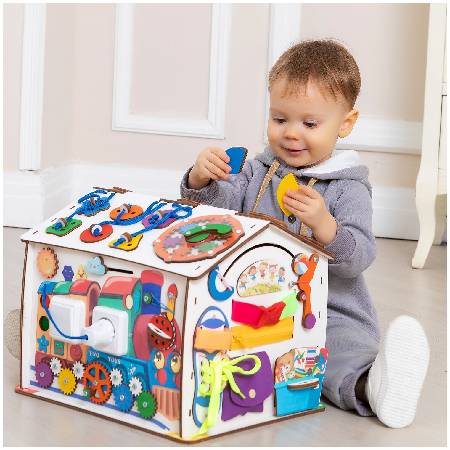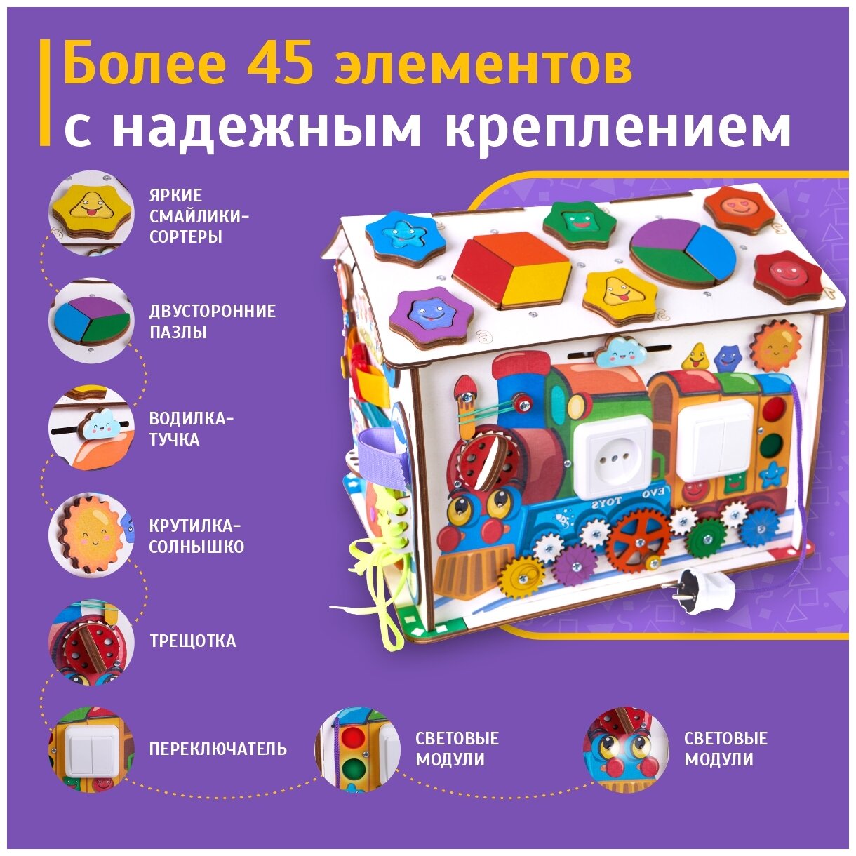 Бизиборд Evotoys развивающий Домик Смайлики на паровозике со светом