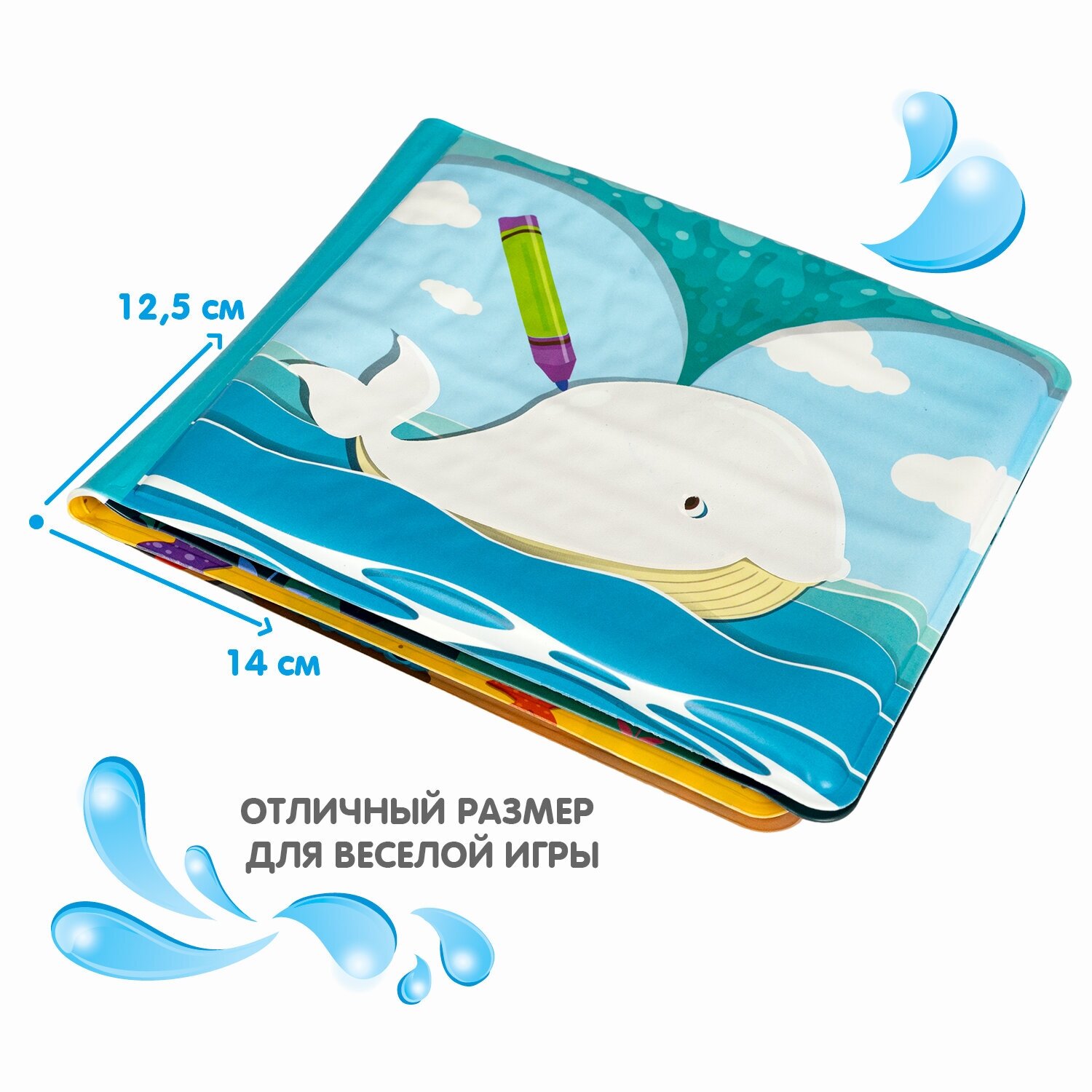 | Комплектация | Детская игрушка для купания в ванной содержит 8 ярких страниц с развивающими и обучающими картинками. |