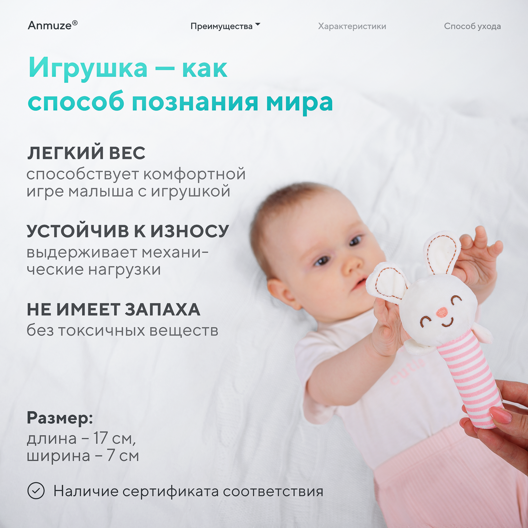 | Развивающие элементы | пищалка, трещотка, шуршащие и хрустящие элементы |